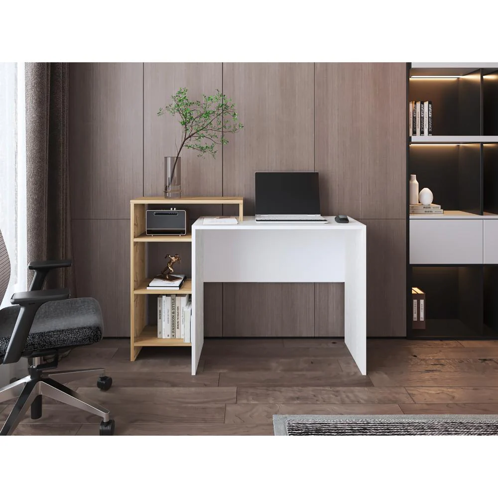 Escritorio, con amplia superficie de trabajo, cuenta con tres entrepaños laterales para ubicar libros y/o elementos decorativos.