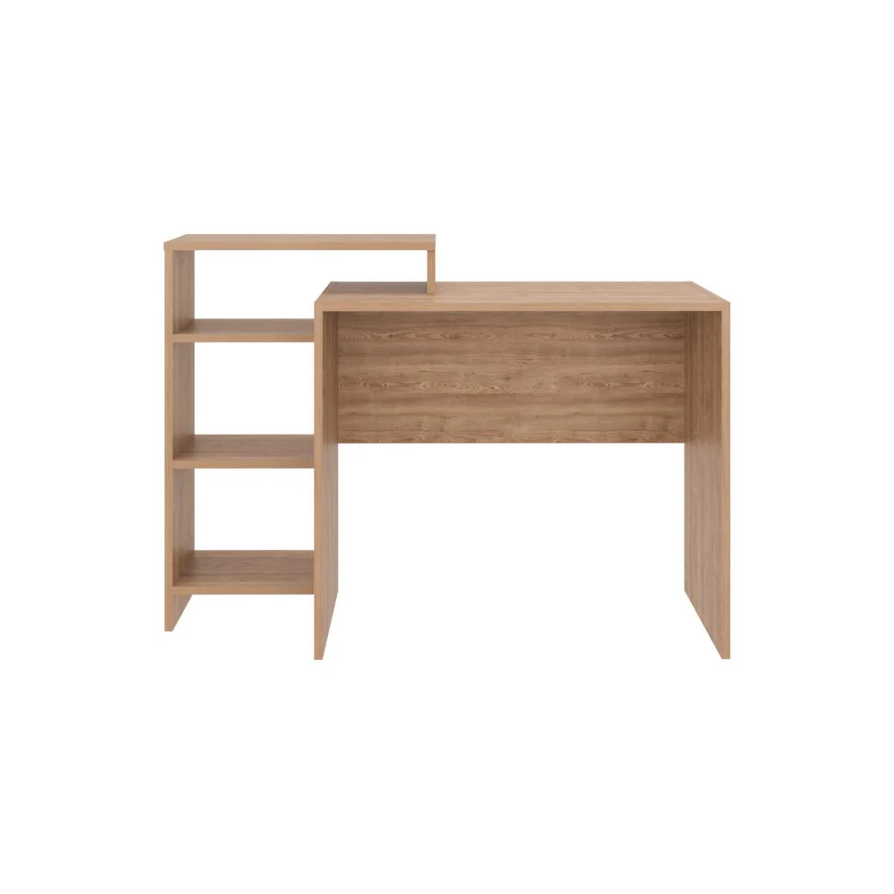 Escritorio, con amplia superficie de trabajo, cuenta con tres entrepaños laterales para ubicar libros y/o elementos decorativos.