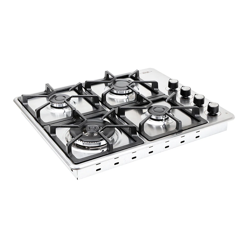 Estufa de empotrar acero inoxidable de 60×51 fácil limpieza con perillas removibles, fogones en diferentes tamaños y quemadores sellados, encendido automático y parrillas en platina.