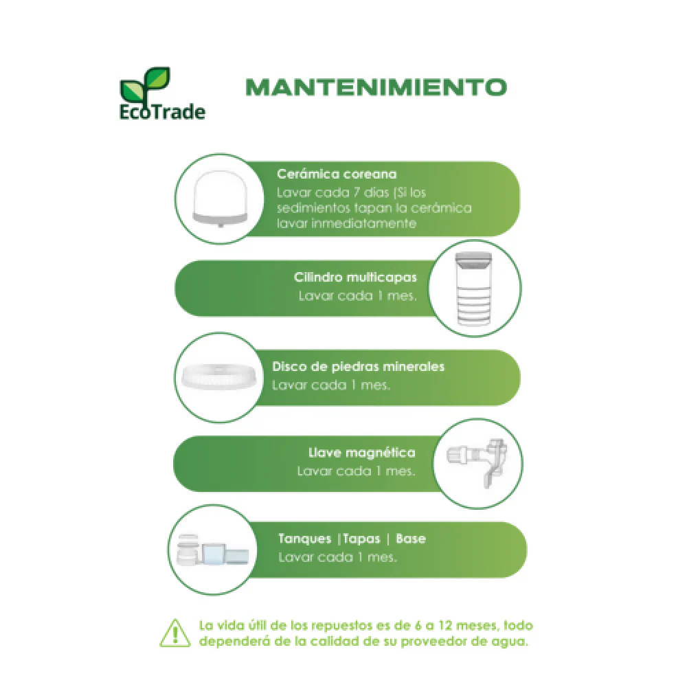 – Filtro de Cerámica Coreana: Retiene sedimentos y bacterias, evita enfermedades graves (Cólera, Fiebre tifoidea, Disentería) con poros de 0.2 micras.
