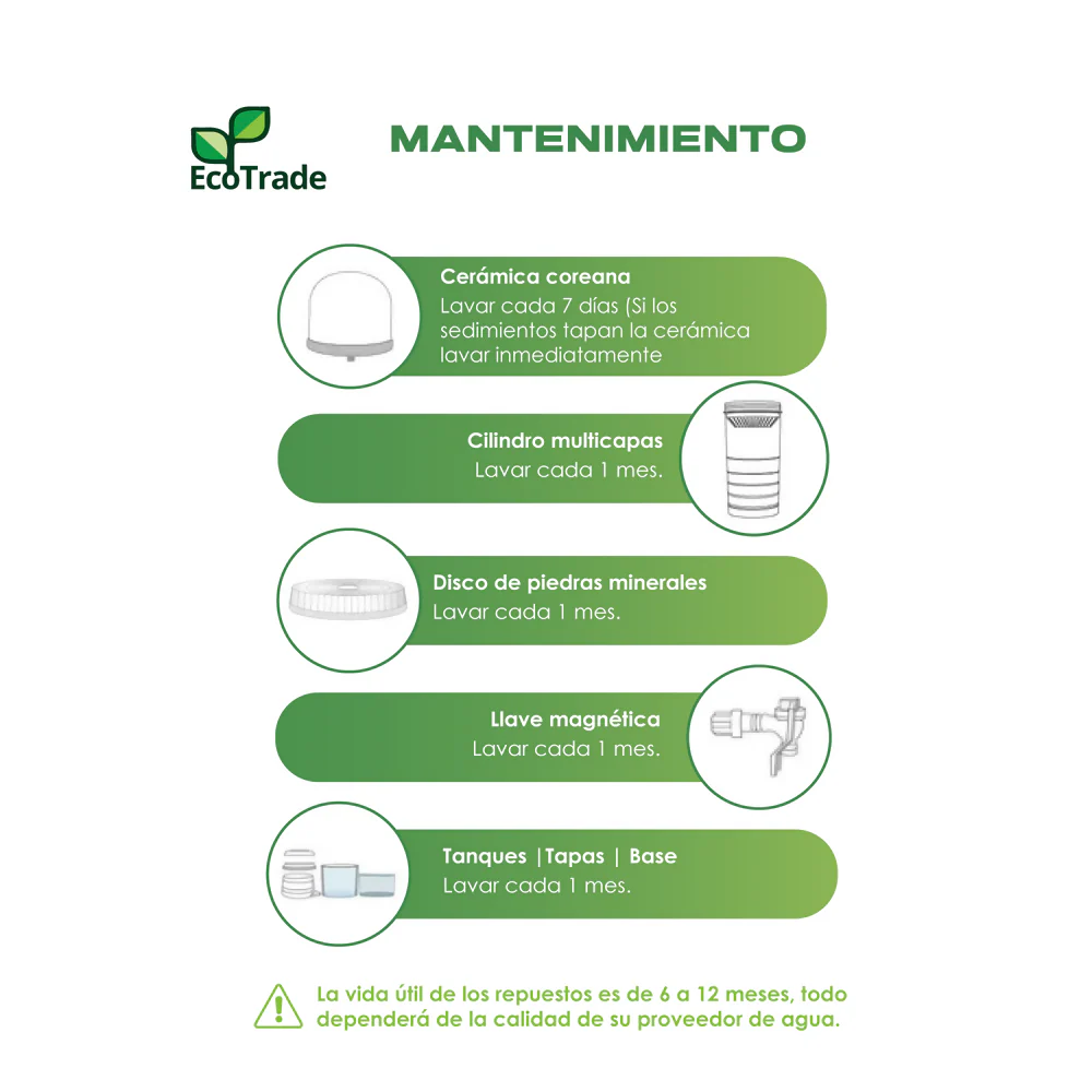 – Filtro de Cerámica Coreana: Retiene sedimentos y bacterias, evita enfermedades graves (Cólera, Fiebre tifoidea, Disentería) con poros de 0.2 micras.