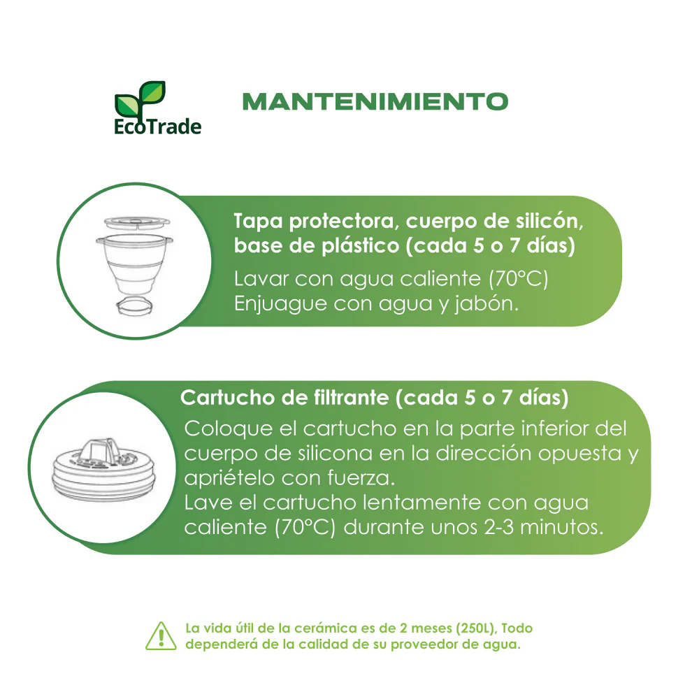 o Incluye una tapa protectora, cuerpo de silicón, base de plástico, cartucho de filtro y una etiqueta de recordatorio de repuesto.