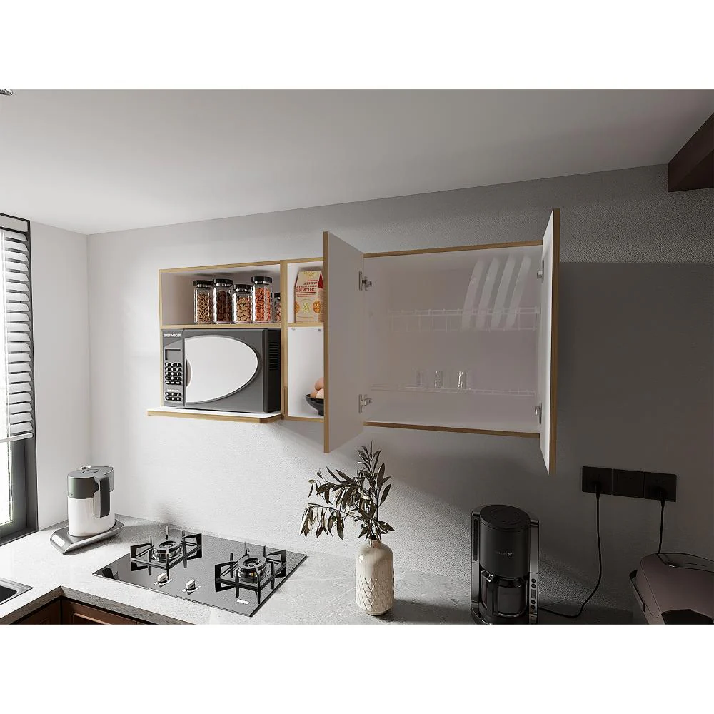 Gabinete Superior , con cuatro puertas abatibles, manijas metálicas, incluye locero y portavasos, gran espacio para almacenamiento.