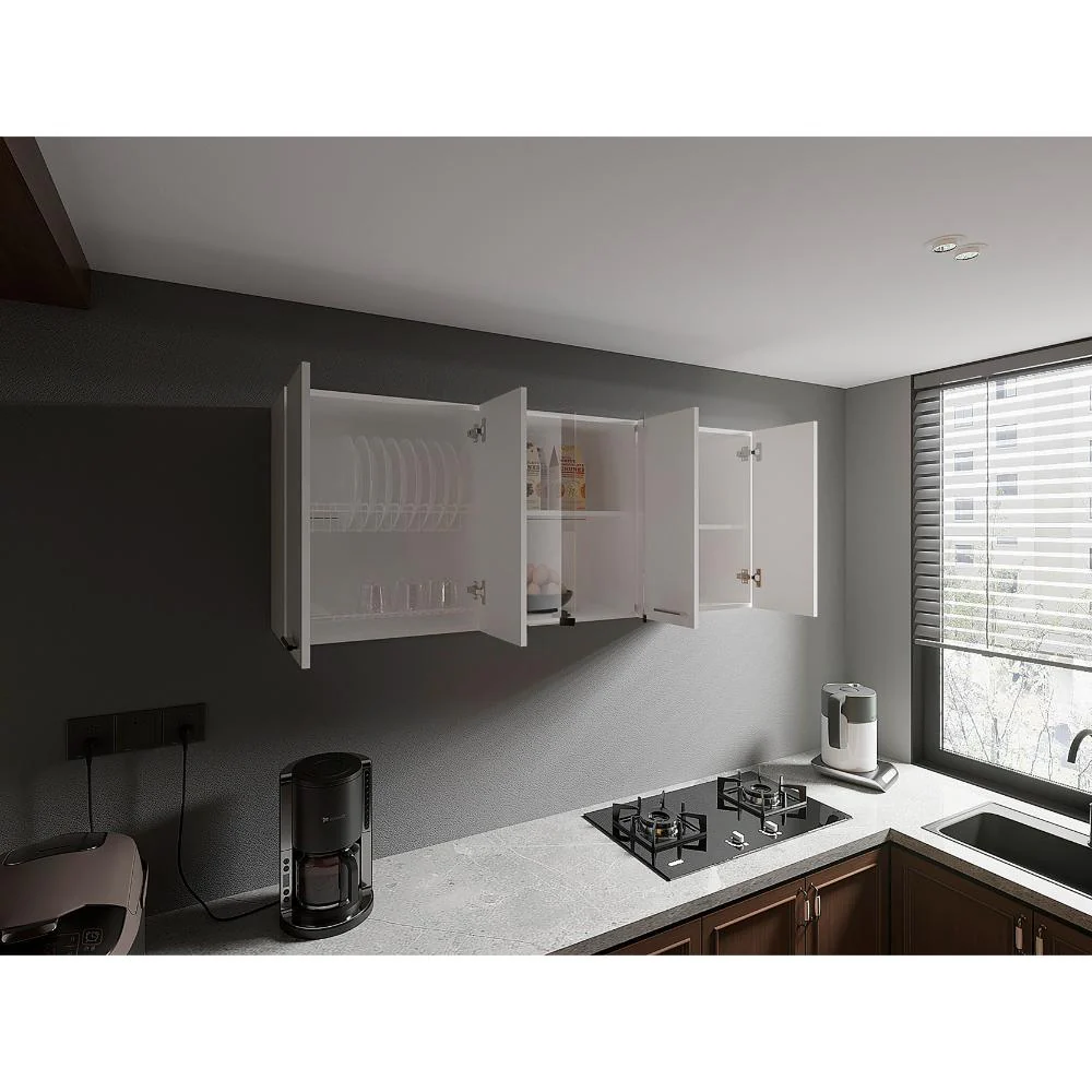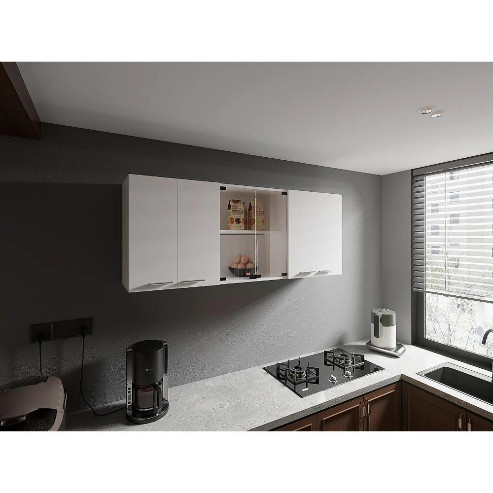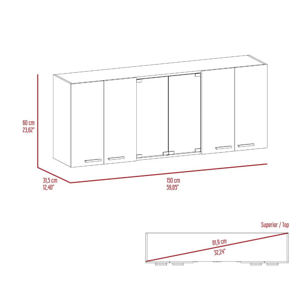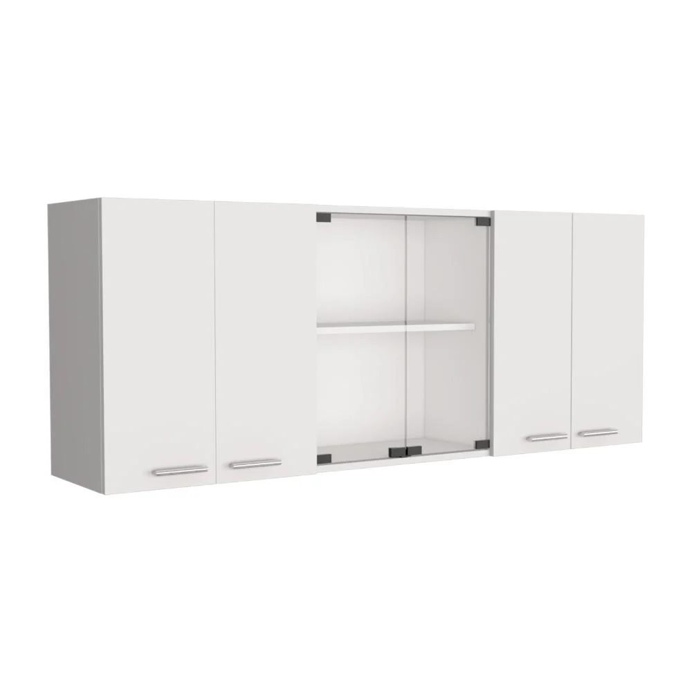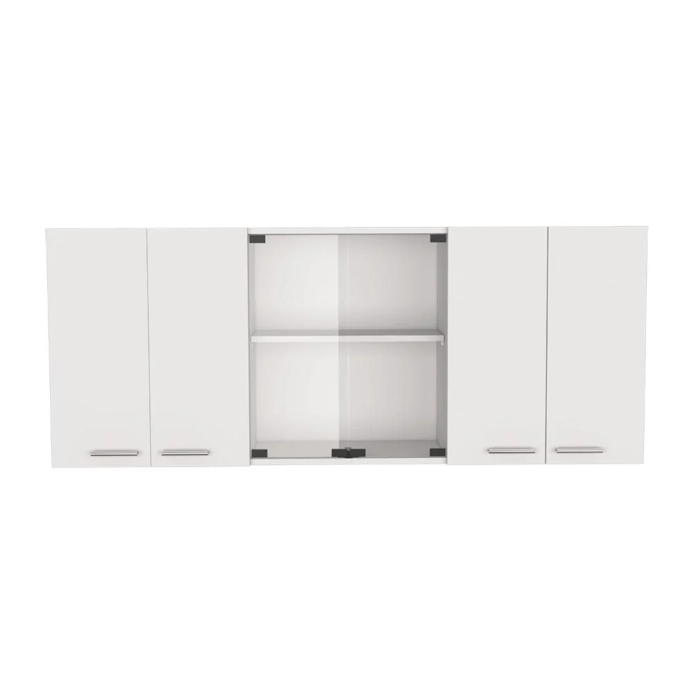 Gabinete Superior, con amplios espacios para guardar utensilios de cocina o alimentos, 4 puertas abatibles, manijas metálicas, entrepaño móvil central, e incluye dos puertas centrales de vidrio,