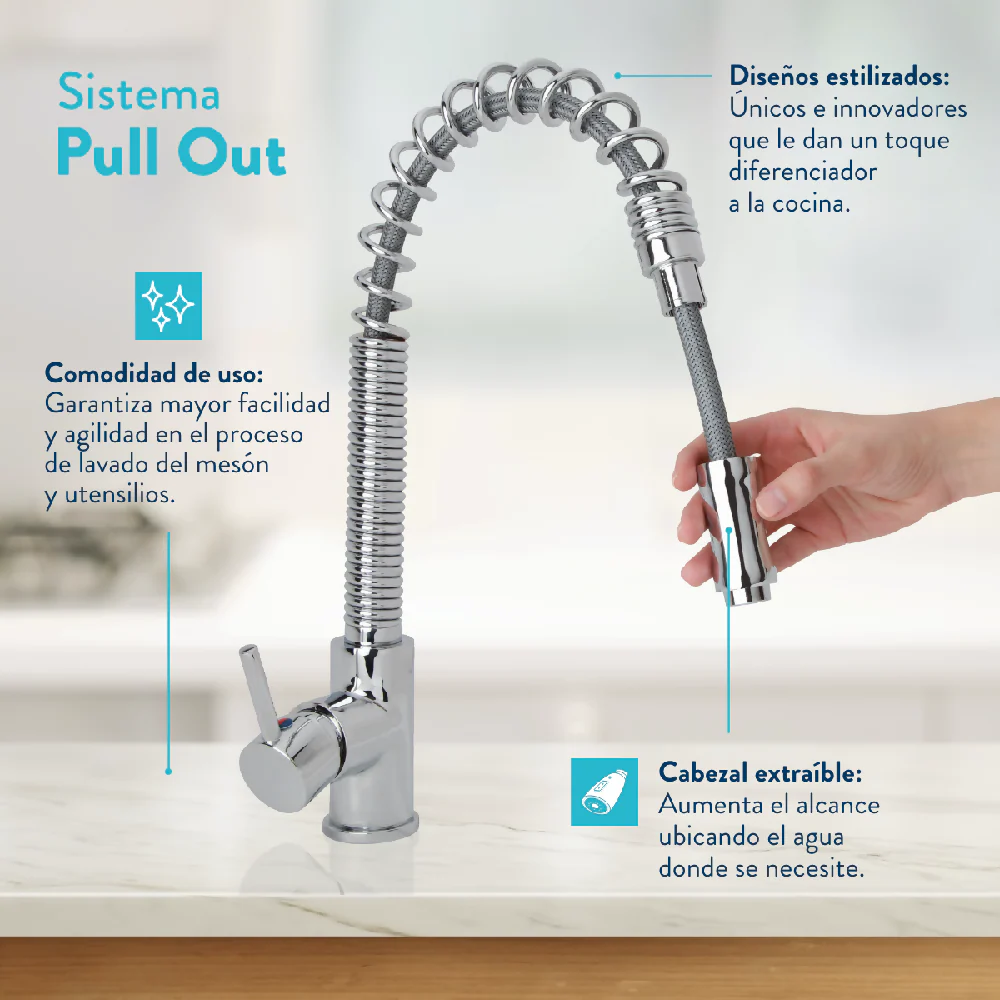 – Sistema pull out de manguera extendible para garantizar el alcance en todo el lavaplatos.