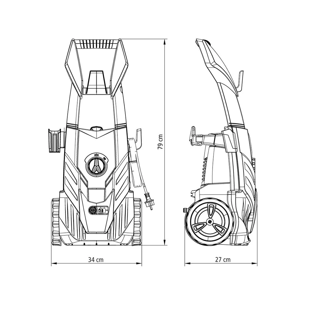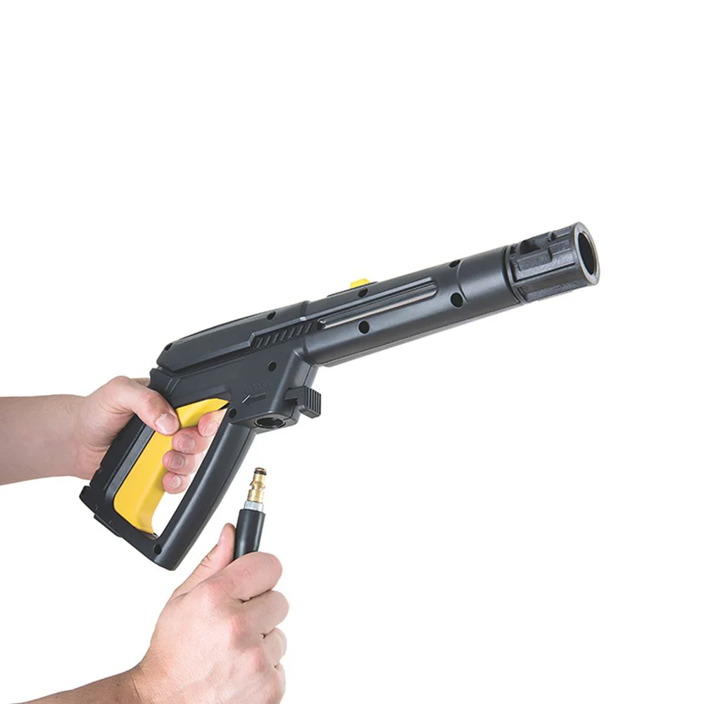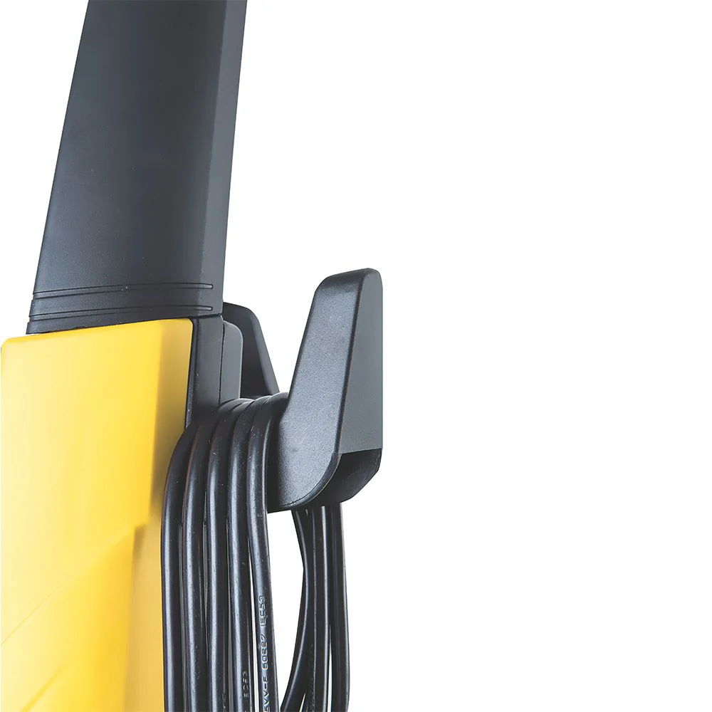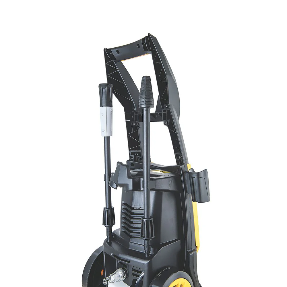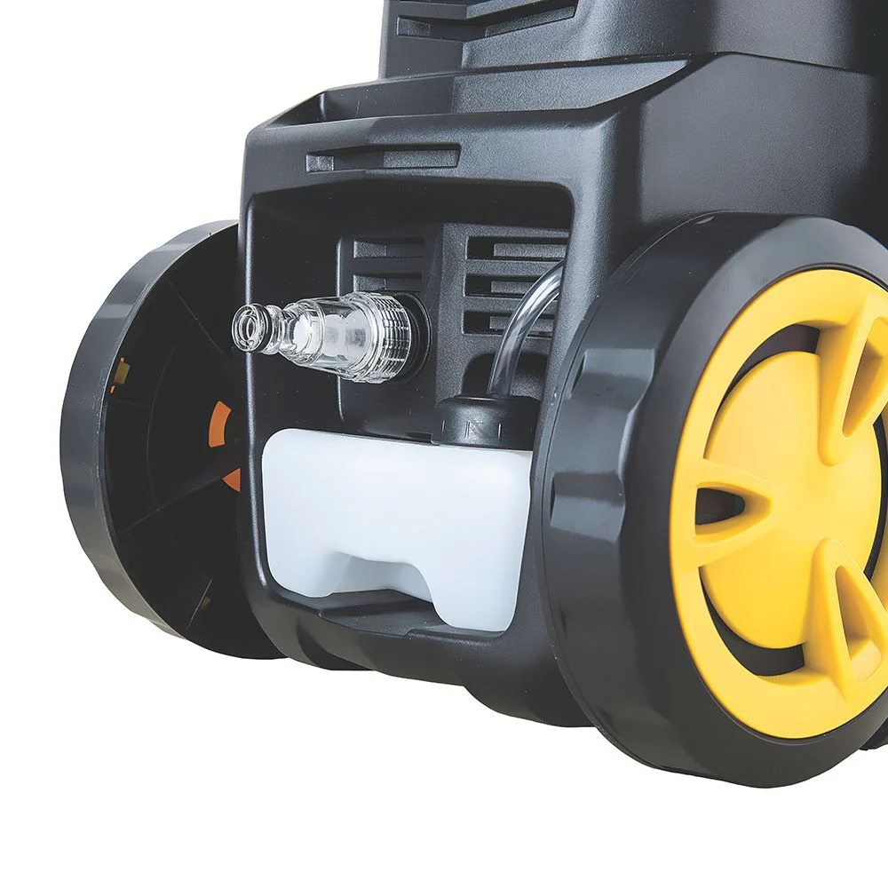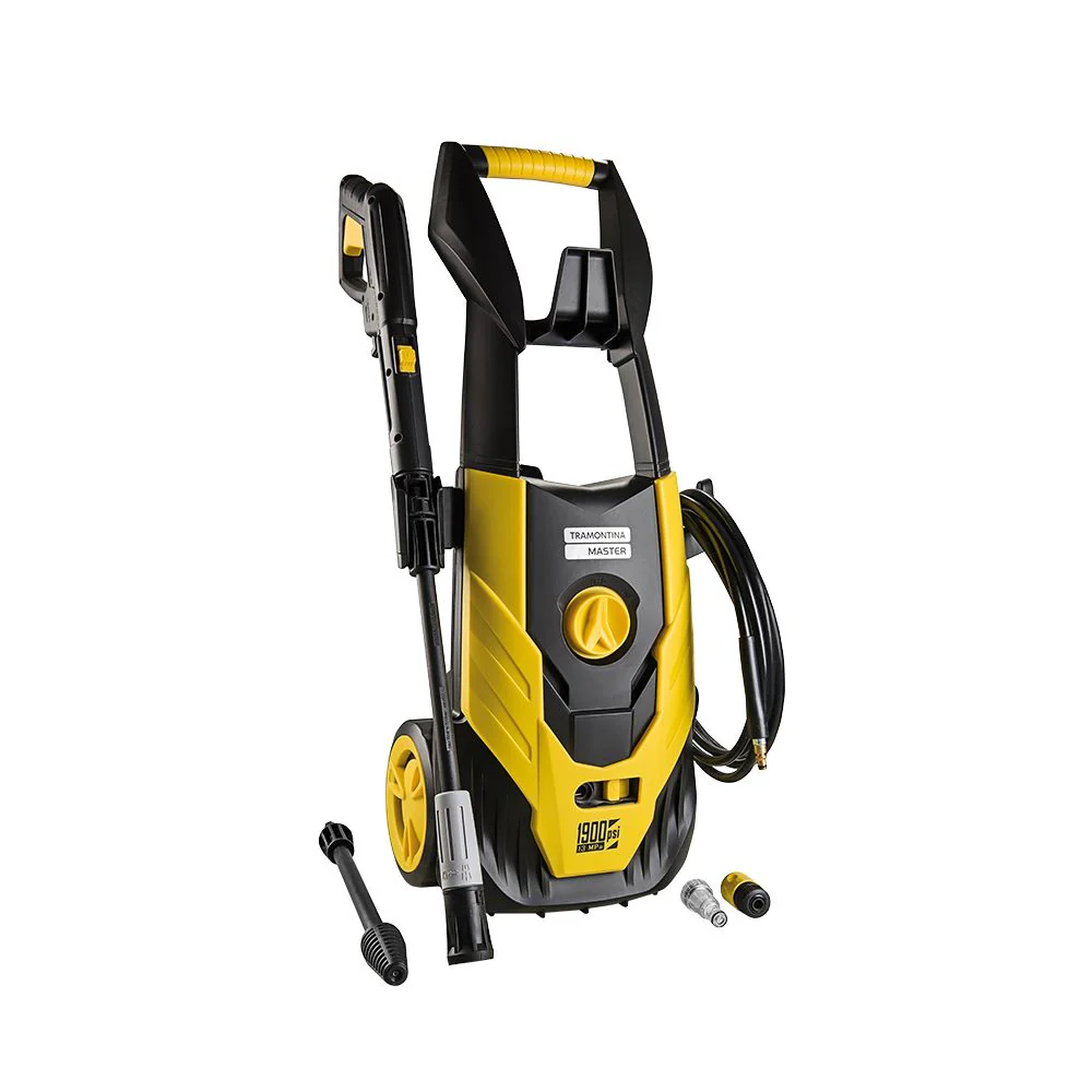 Hidrolavadora, elaborado en Bomba de agua en aluminio, Manguera de alta presión de 3 metros, presión máxima 1600 psi, presión de trabajo 1100psi, caudal 5,5 -6,5 I/min, potencia de 1400 w, tensión 127v, motor equipado con sistema de stop total, Color Negro y Amariilo.