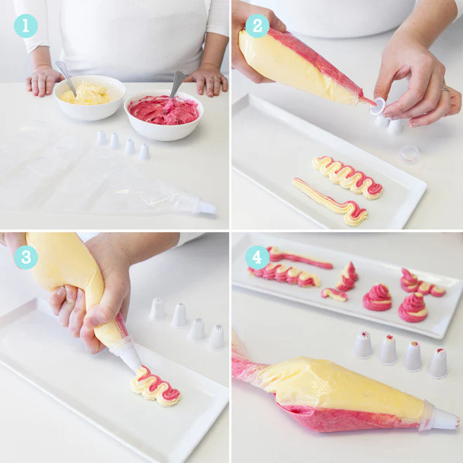 Las mangas de 2 compartimientos permiten decorar con 2 colores o sabores diferentes a la misma vez.