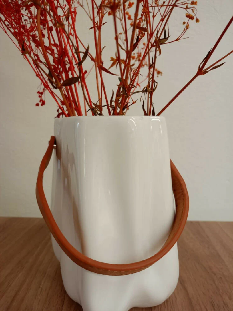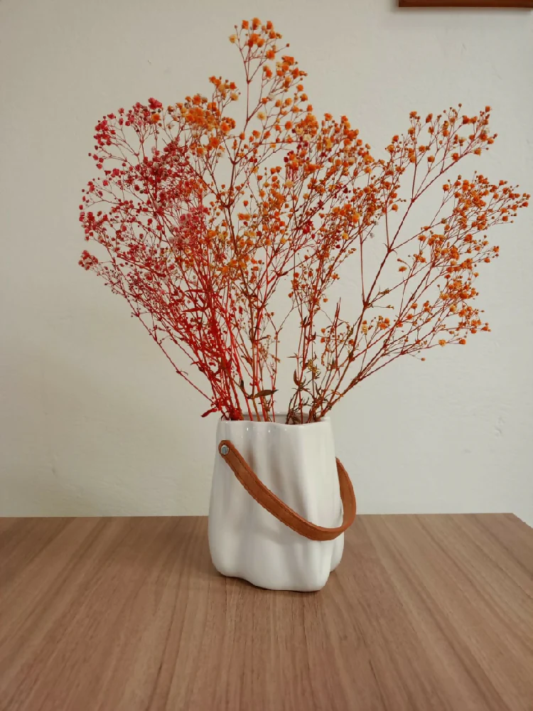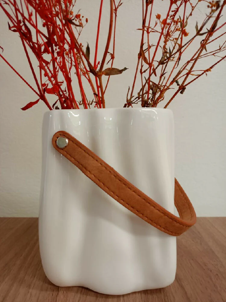 Suma un toque de elegancia sutil a tu decoración con este hermoso Jarrón Alba. Su diseño compacto y su delicada textura ondeada crean un efecto visual encantador, mientras que su correa de cuero añade un contraste sofisticado y moderno. Perfecto para decorar mesas, estanterías o rincones especiales con un aire minimalista y natural