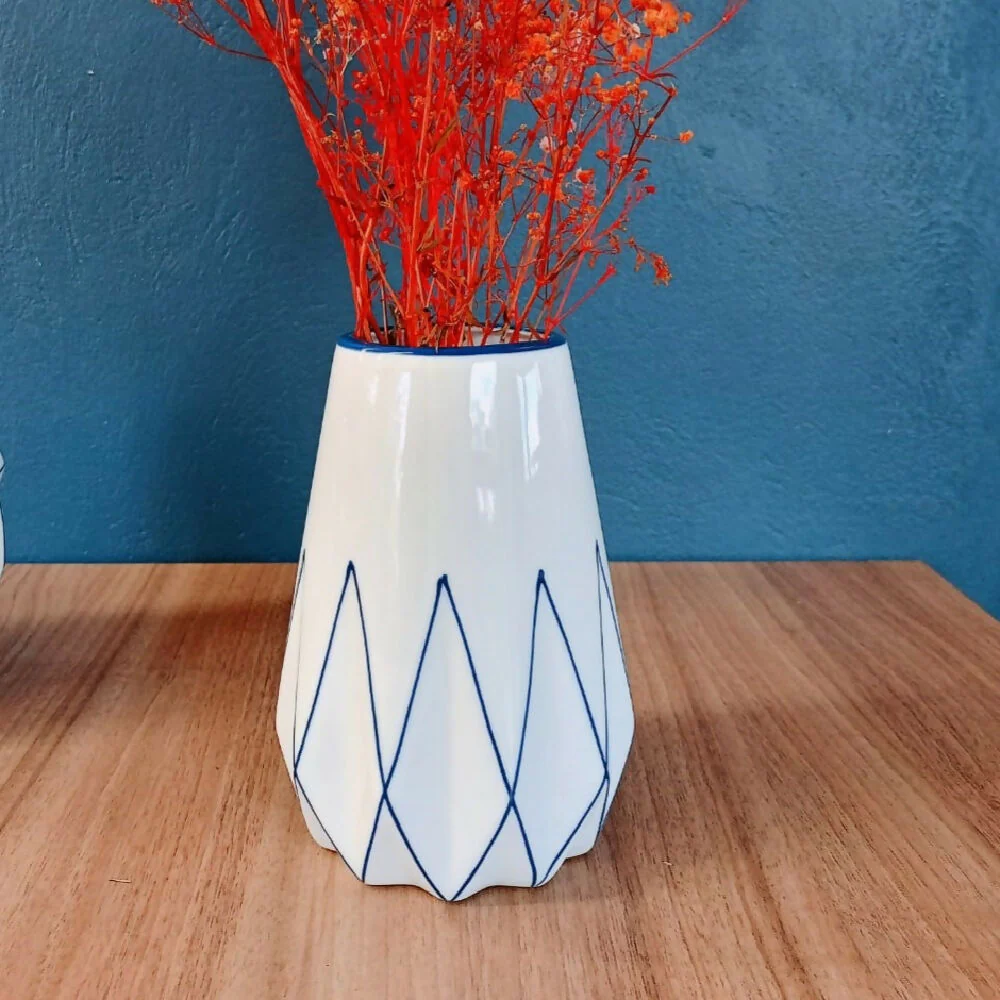 Dale un toque moderno y sutil a tu hogar con nuestro impresionante Jarrón Prisma Circular de cerámica esmaltada. Su diseño geométrico y acabado brillante lo convierten en una pieza única que destaca en cualquier espacio, ya sea con flores o como un elemento decorativo por sí solo. Perfecto para salas, comedores y rincones especiales que buscan un aire contemporáneo.