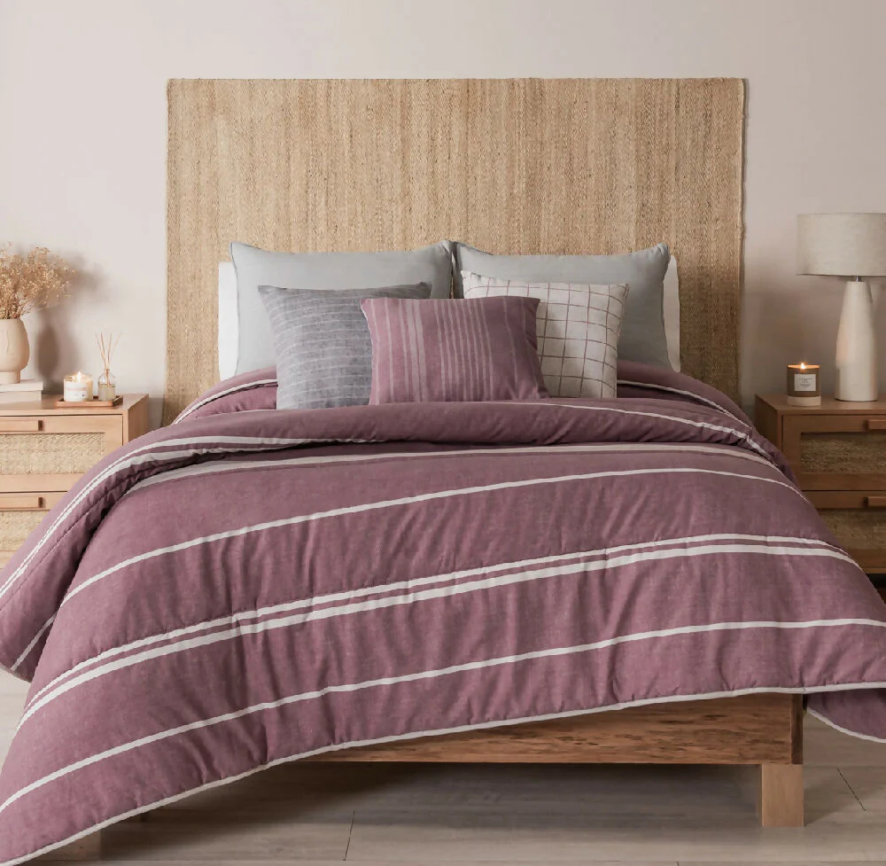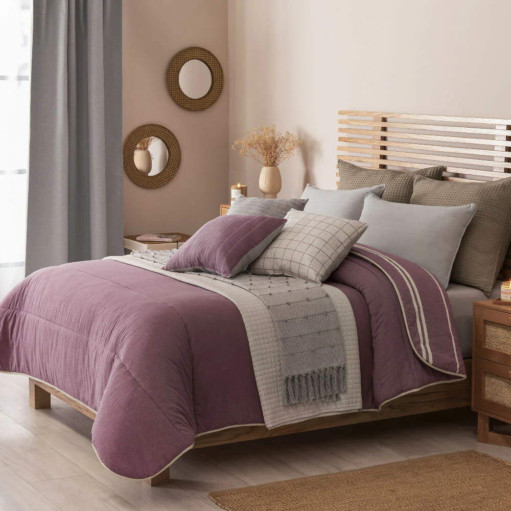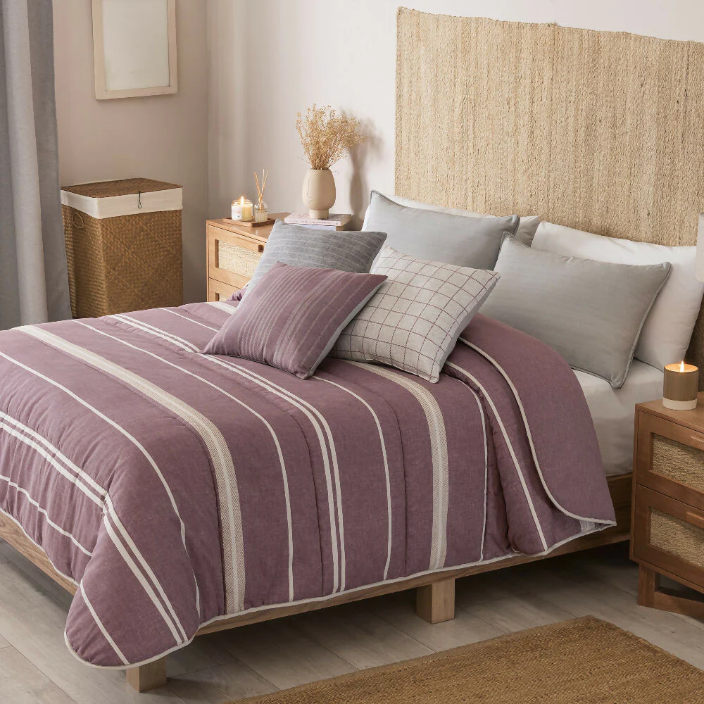 Juego de Edredón Córdoba para cama Doble y Queen. Doble Faz para darle un toque renovado a tu habitación. Incluye 2 Fundas y 2 Cojínes cuadrados. Con un suave y delicado acolchado para que tus noches sean más calientitas y confortables.