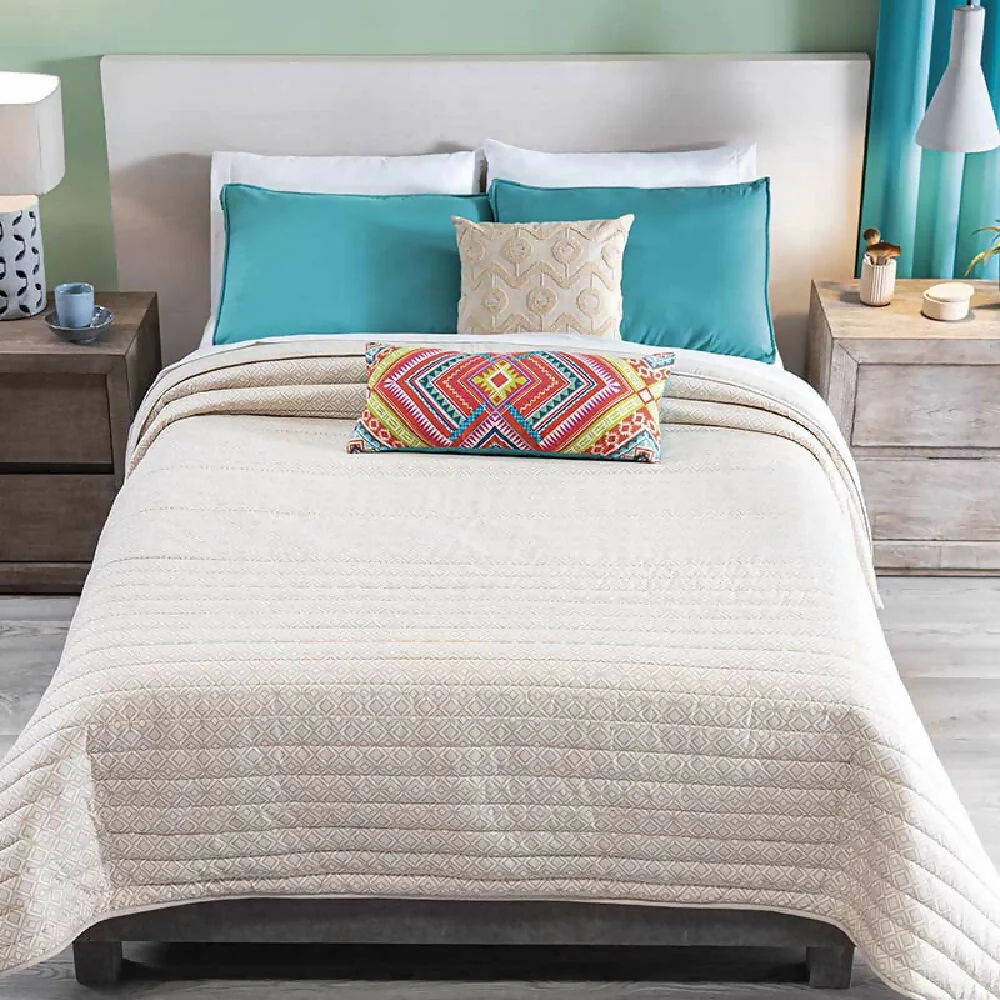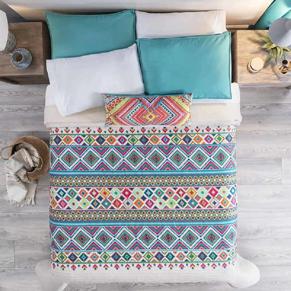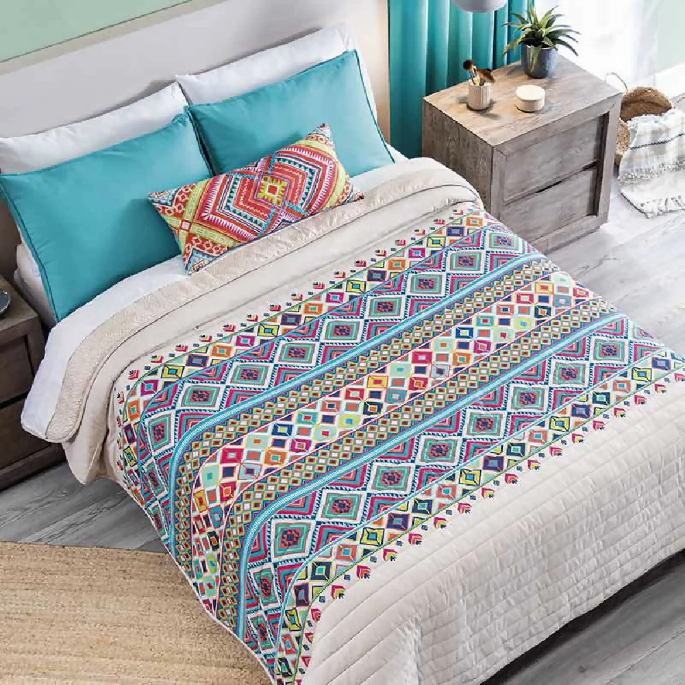 Juego de Edredón Dilar para cama Doble y Queen. Incluye 2 Fundas y 1 Cojín rectangular. Con un suave y delicado acolchado para que tus noches sean más calientitas y confortables. Estilo étnico con figuras geométricas y llenas de color en contraste con tonos arena. Le da a tu cama un toque muy fresco.