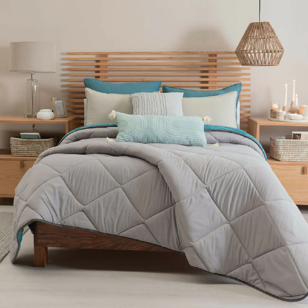 Juego de Edredón Sisal para cama Doble y Queen. Doble Faz para darle un toque renovado a tu habitación. Incluye 2 Fundas y 2 Cojínes (cuadrado y rectangular). Con un suave y delicado acolchado para que tus noches sean más calientitas y confortables.