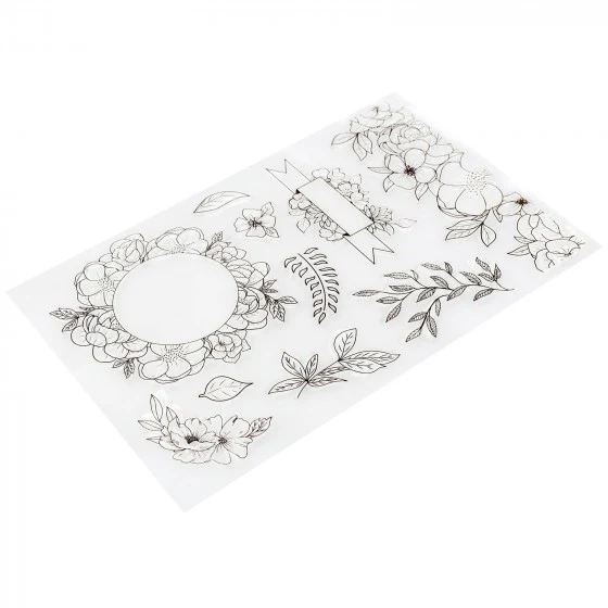Planilla de Sellos Importados hechos de polímero transparente autoadheribles que se utilizan con la ayuda de un bloque de acrílico (**se vende por separado).
