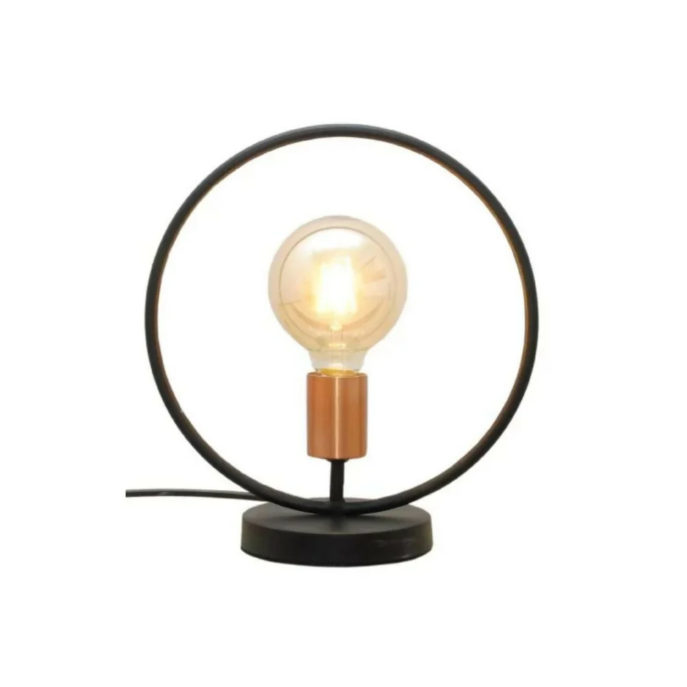 DESCRIPCION BASICA: Lámpara mesa 1 luz, diseño porta bombillo clásica. Aro en tubería de 3/8 de 25cm de diamtro. Fabricada en aluminio de alta pureza o lamina de hierro cold rolled. Cable encauchetado 2×18. Enchufe y suiche de paso. Base plana, con platina galvanizada de fijación, con polaridad a tierra. Socket de loza, recubierto con porta socket metálico, rosca E-27. 1 terminal plástica de 5 amperios. Se recomienda un bombillo Led, vintage (según la necesidad del cliente) Acabado según el requerimiento del cliente.