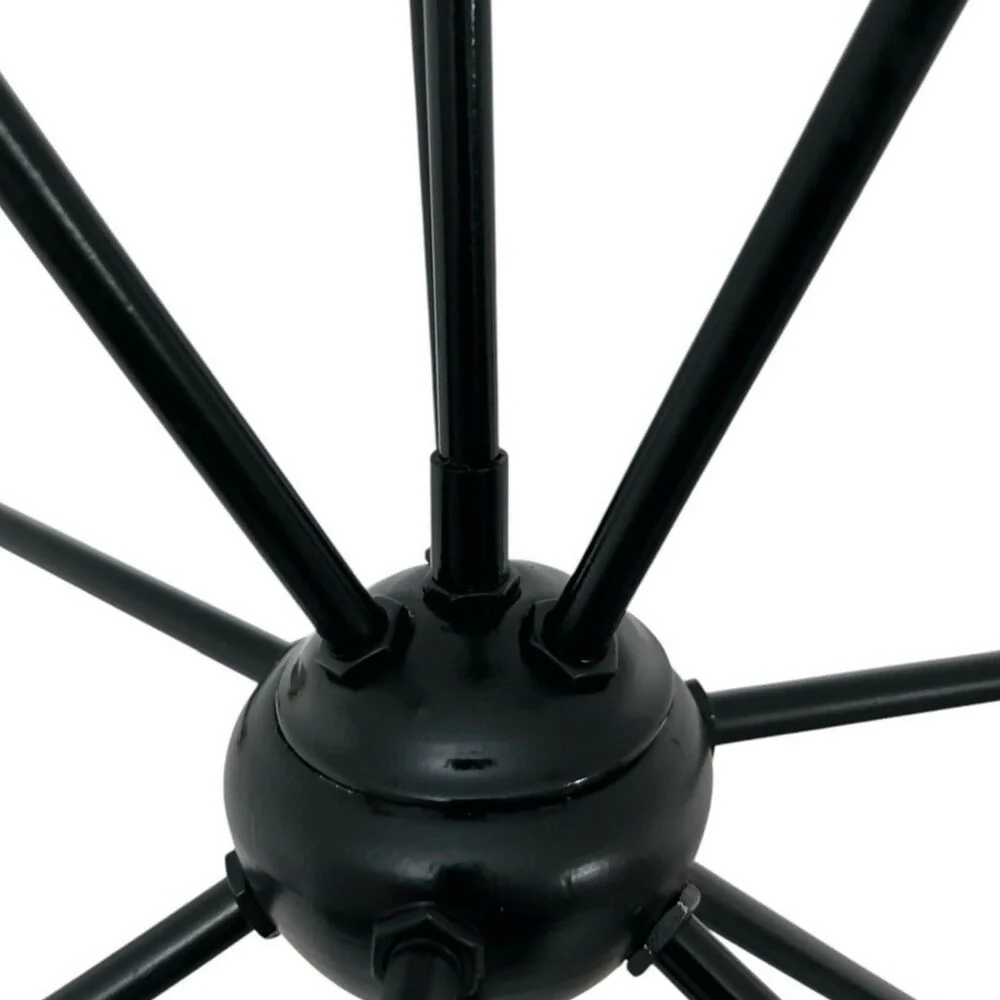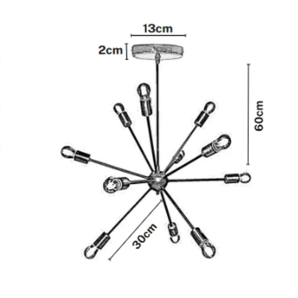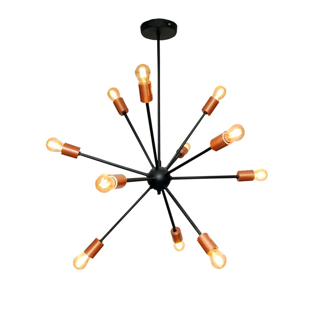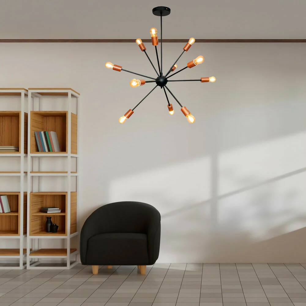 Lámpara de techo con diseño tipo átomo, equipada con 12 brazos de 30 cm cada uno, ideal para ambientes residenciales, comerciales o industriales. Su acabado combina colores cobre y negro, ofreciendo un estilo elegante y moderno que se adapta a cualquier espacio.