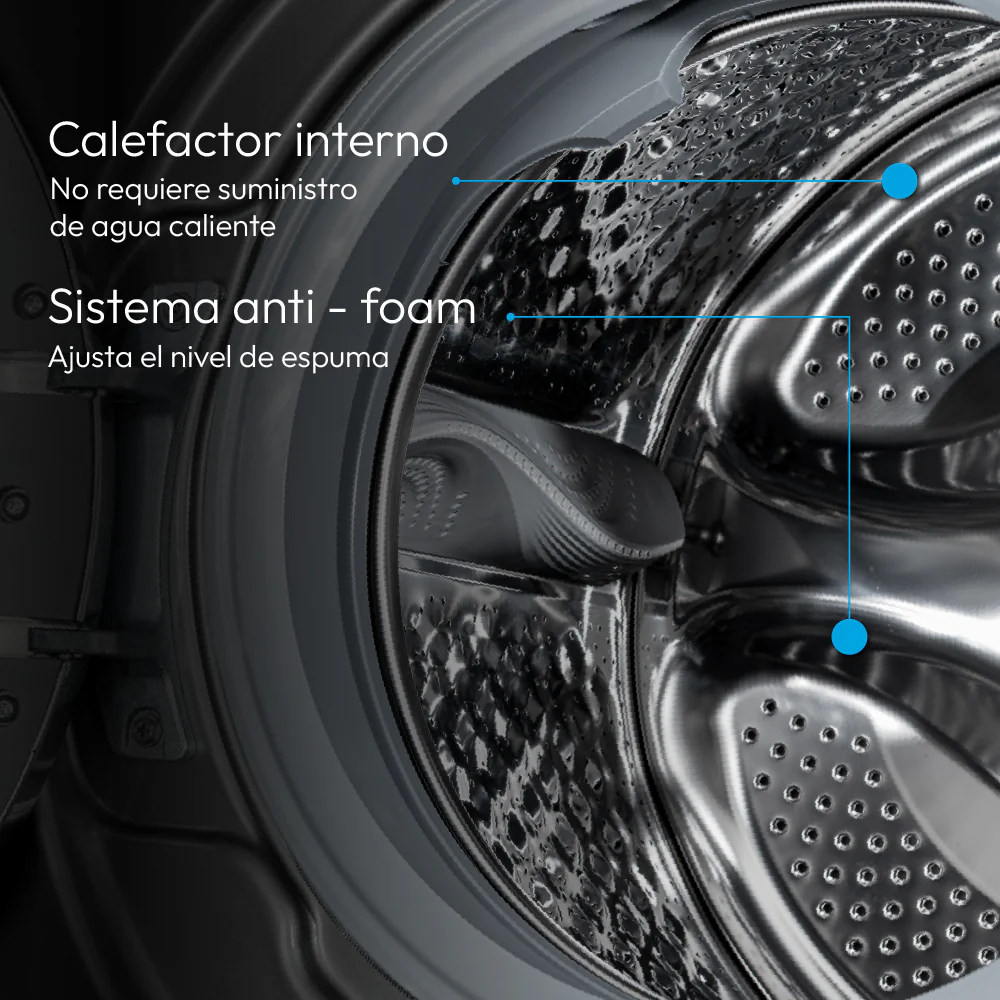 La lavadora incluye un sistema Anti-Foam que ajusta el nivel de espuma, y un programa de enjuague extra para una limpieza más profunda. Su diseño frontal con puerta de amplio visor permite una fácil carga y descarga, y su sistema de bloqueo para niños garantiza seguridad en el hogar. Con dimensiones se adapta perfectamente a cualquier espacio.