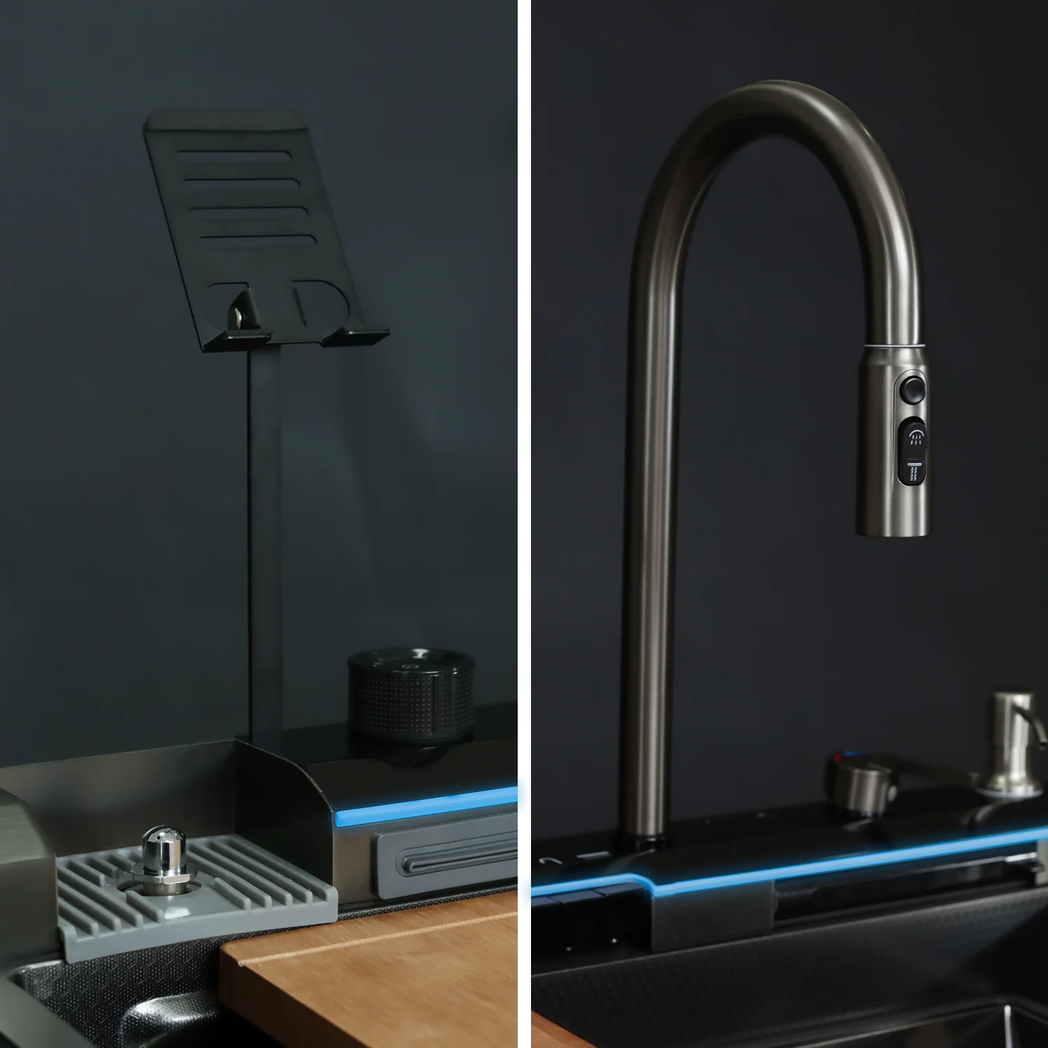 – Grifería multifuncional con luz LED: Cuenta con un grifo de alta gama con luz LED, brindando un toque sofisticado. Además, su sistema extraíble y con doble función (chorro y lluvia) facilita la limpieza de utensilios y alimentos.