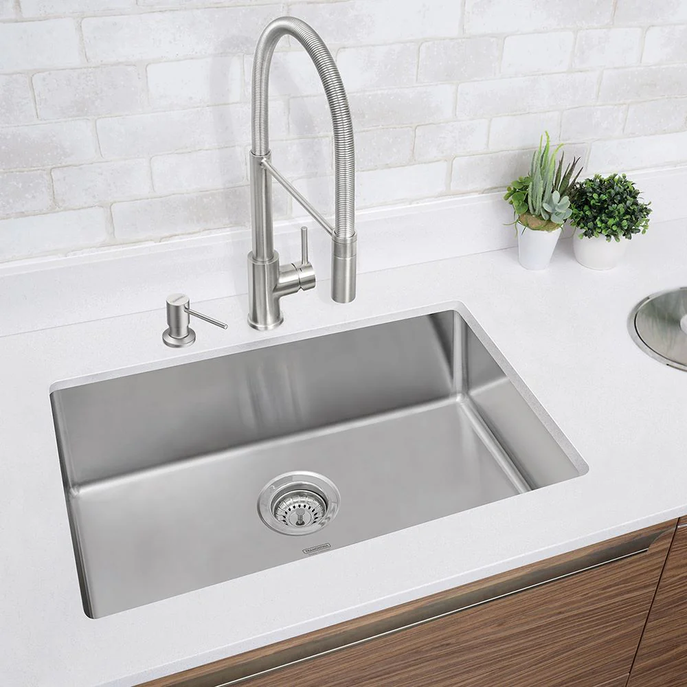 Lavaplatos, elaborado en Acero inoxidable,con espesor de 1 mm y acabado Scotch Brite. Profundidad de la cubeta 205 mm. Rayo interno de 12 mm.