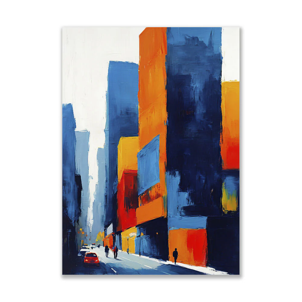 Este cuadro decorativo en lienzo, inspirado es una escena urbana abstracta con edificios en tonos vibrantes de azul, naranja y rojo.