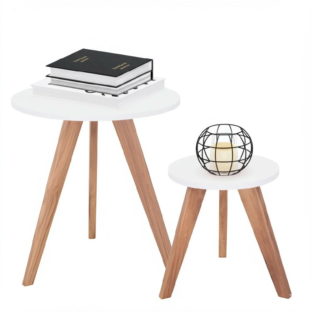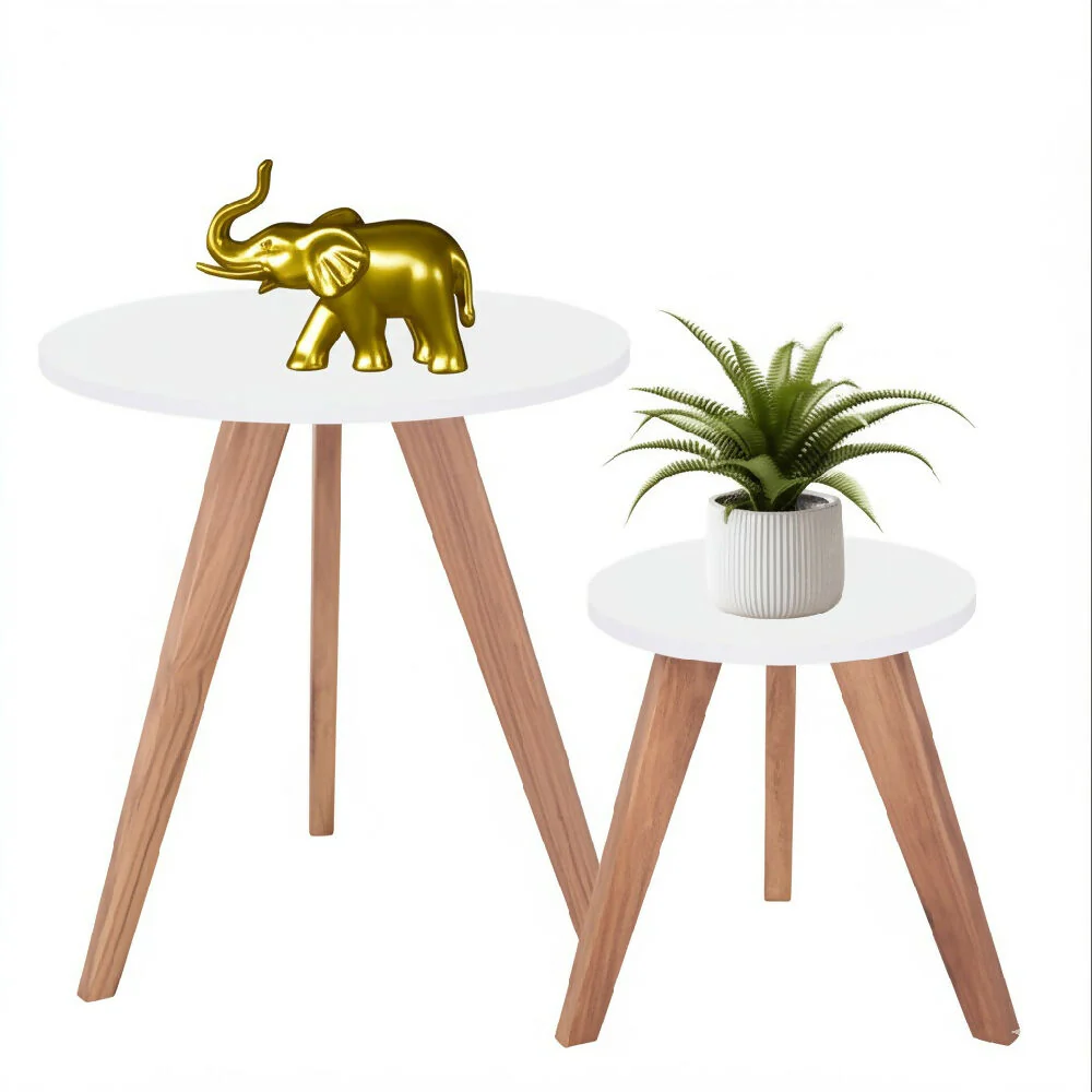 Set de dos mesas auxiliares con diseño nórdica, elaboradas en Madera Solera y láminas melamínicas MDP marca Duratex. superficie con acabado melánico color Blanco Nevado de excelente calidad, ideal para complementar cualquier espacio.
