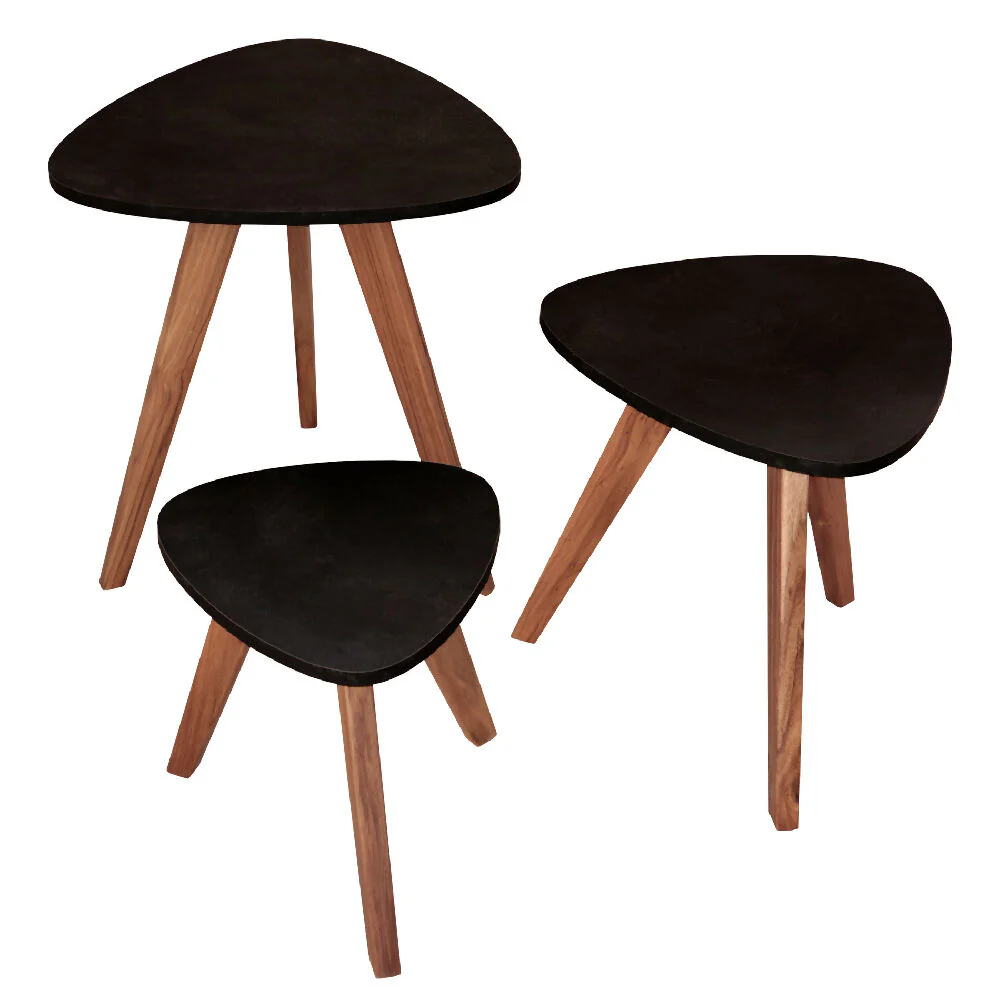 Juego de tres mesas auxiliares con diseño nórdico moderno. Fabricadas con estructura de Madera Solera y láminas melamínicas MDP marca Duratex, superficie con acabado melánico color Etna de excelente calidad, ideal para complementar cualquier espacio. Perfectas para complementar salas, recámaras o áreas de lectura.