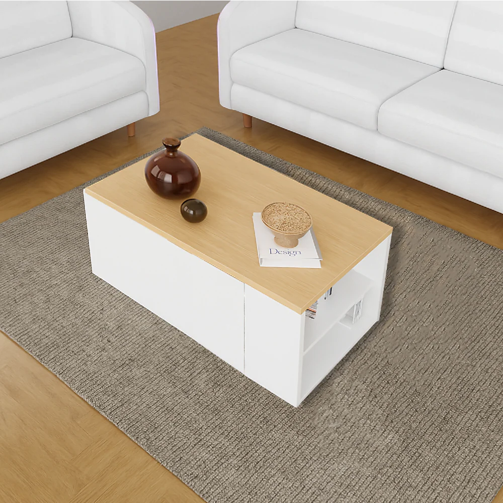 Mesa de Centro Ahorra Espacio DKO (40x80x50) Blanco – Vienes en melamina con protección antimicrobiana al 99,9%, funcional con superficie extensible y amplio espacio de almacenamiento interno