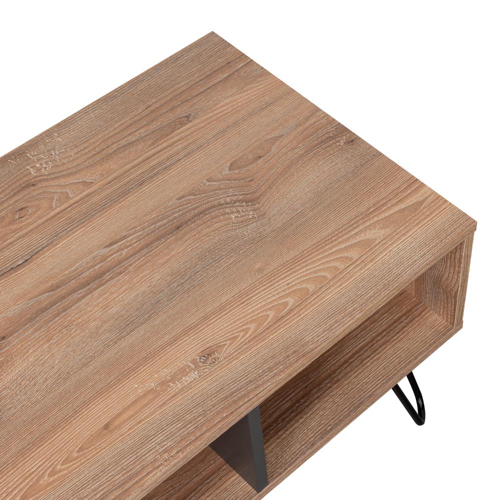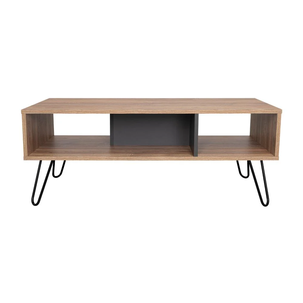 Mesa de Centro, con amplios espacios para elementos decorativos y patas de acero.
