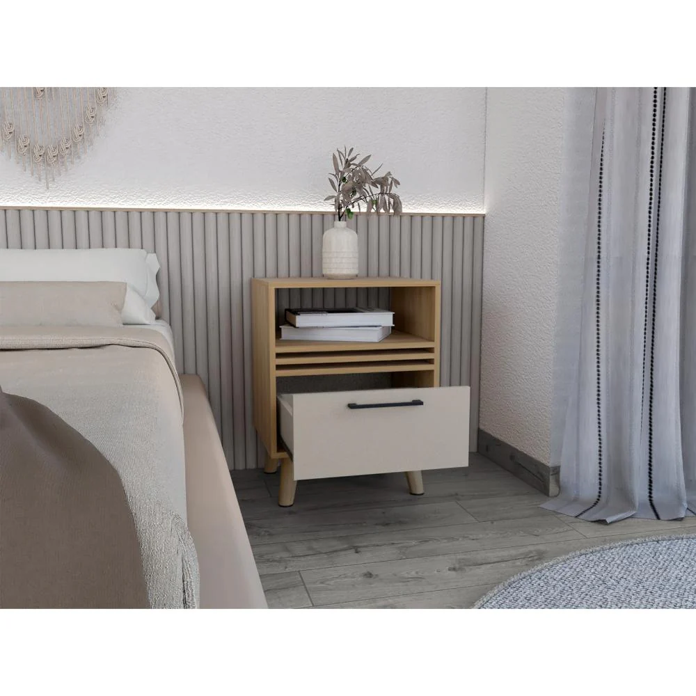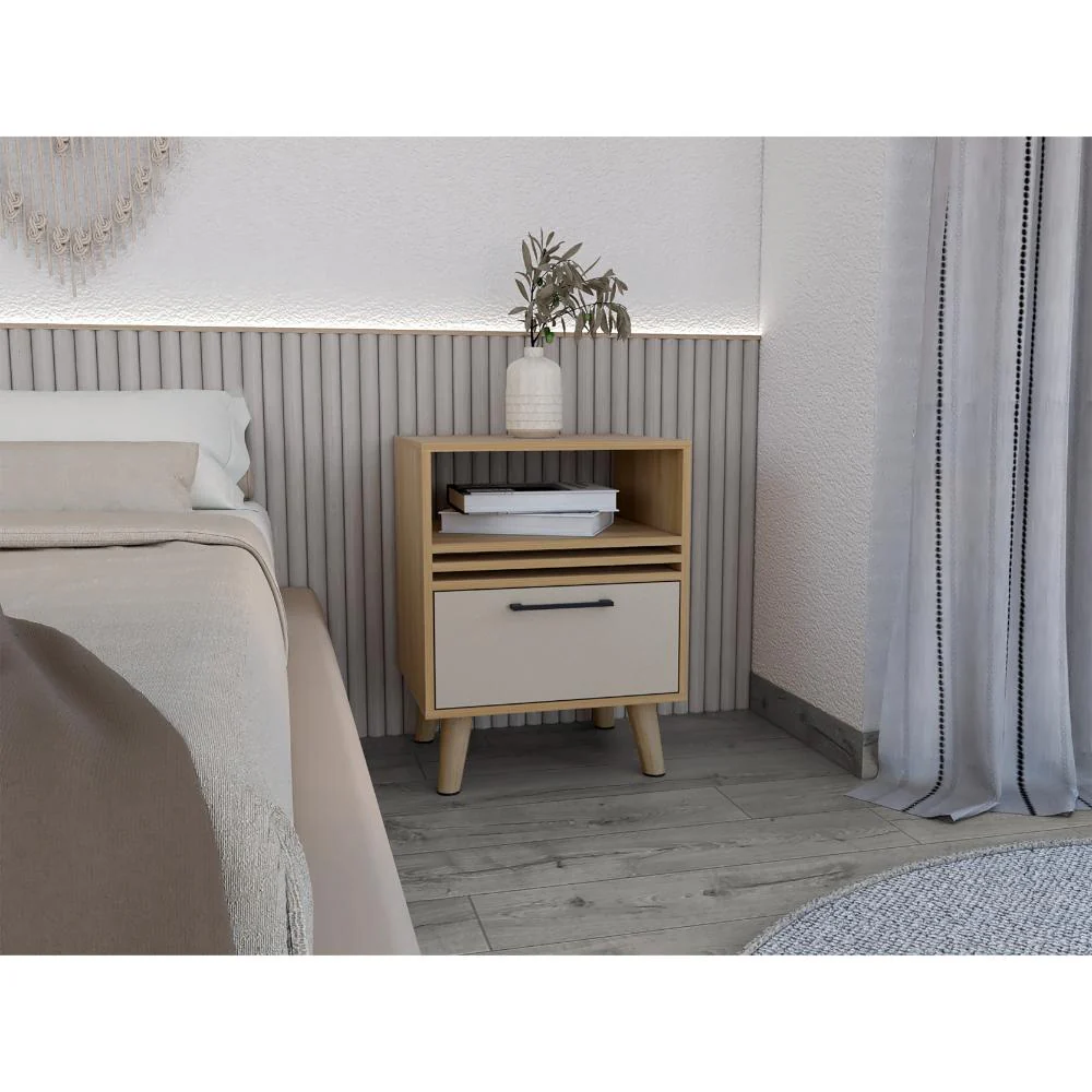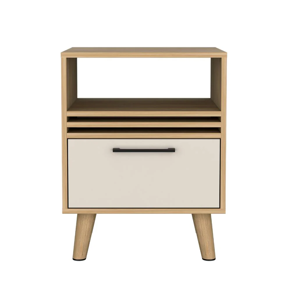 Mesa de noche, con espacio para colocar objetos decorativos, un cajón, facil armado e instalación, cuatro patas de madera