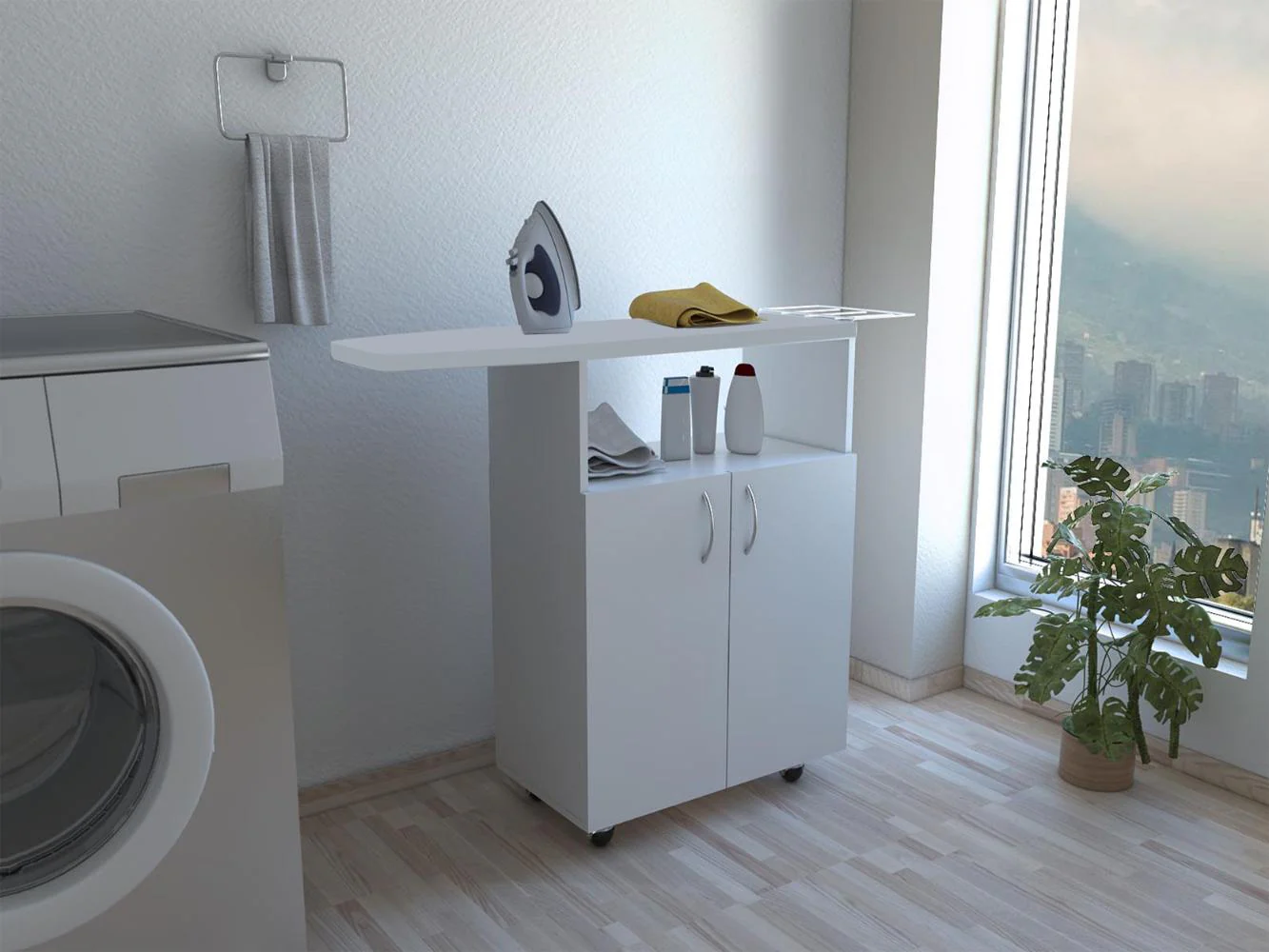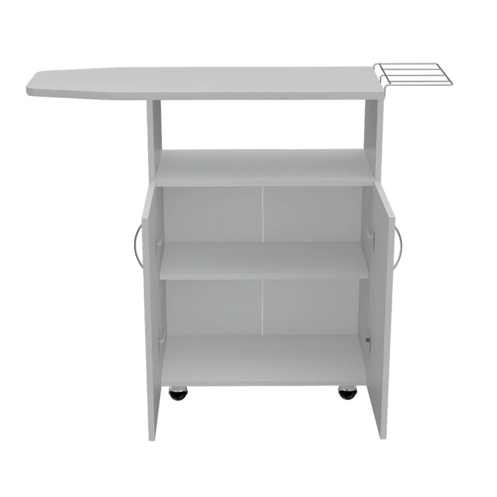 Mesa para Planchar, con compartimientos para almacenar elementos de aseo, amplia superficie para planchar, forro acolchado ajustable soporte rejilla para plancha.