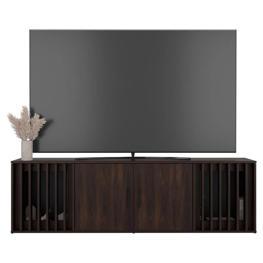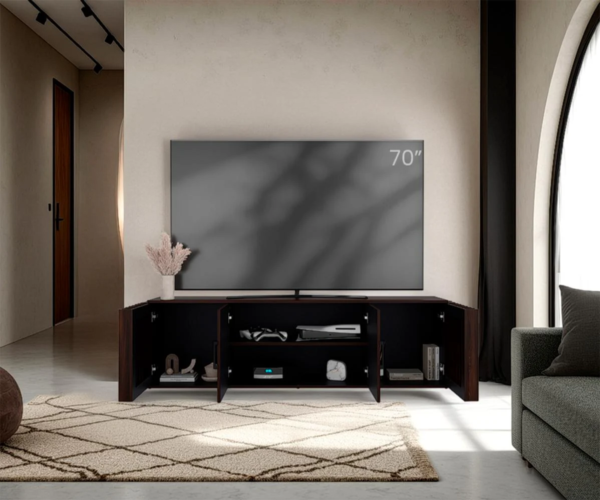 Mesa para TV, con superficie para ubicar objetos decorativos, de audio y video, cuenta con espacio para tv hasta de 70 pulgadas.