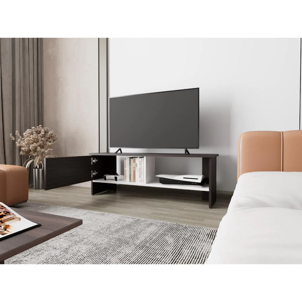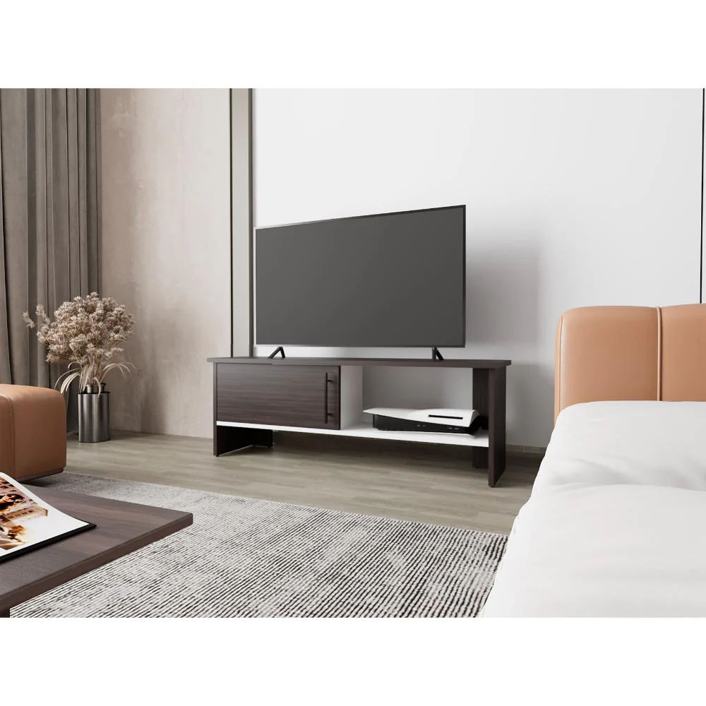 Mesa para TV con diseño moderno, superficie para objetos decorativos y quipos de audio y video, facil de ensamblar e instalar. Puede servir para tv desde 55″ hasta 65″ dependiendo de la base del Televisor.