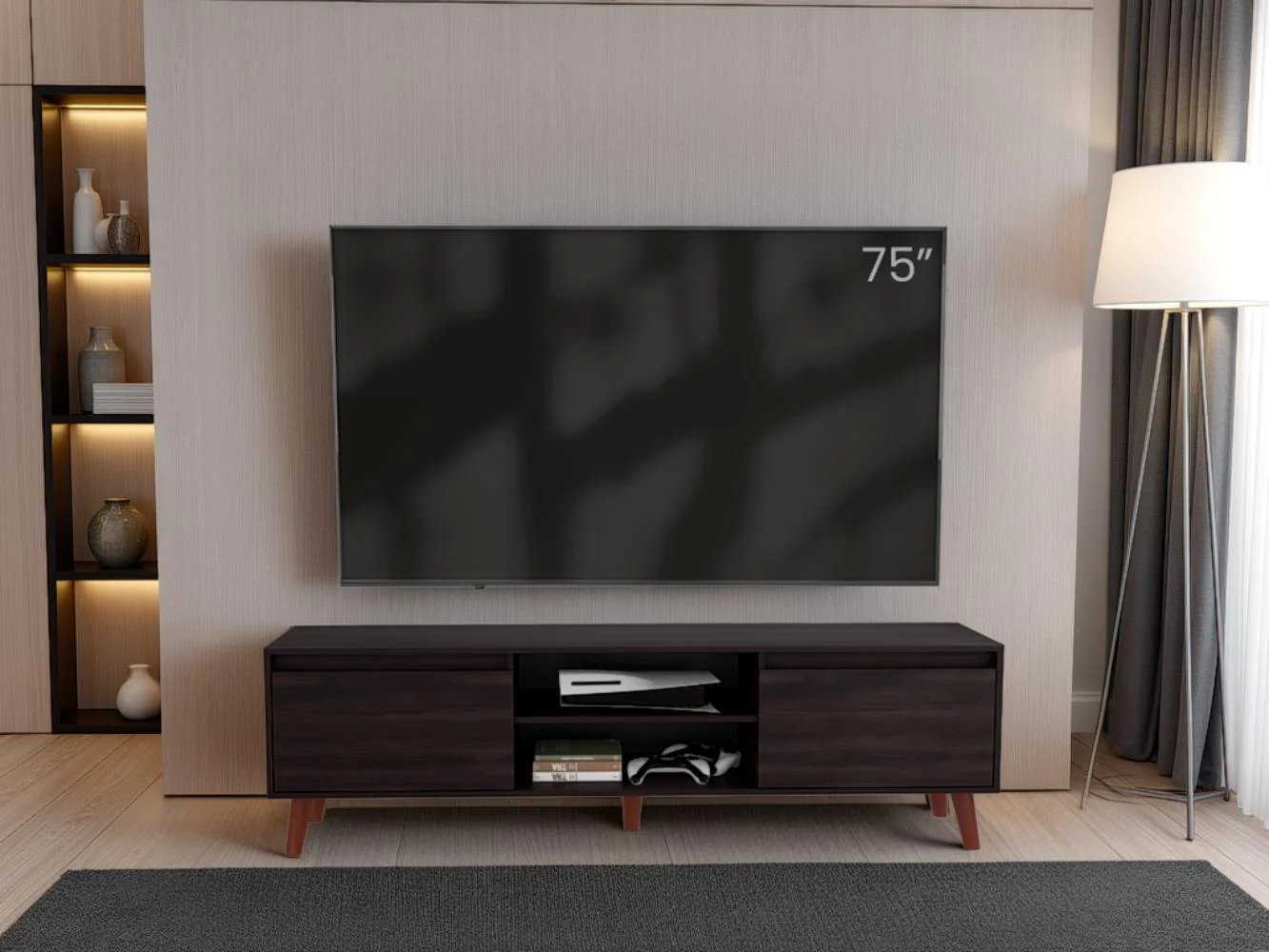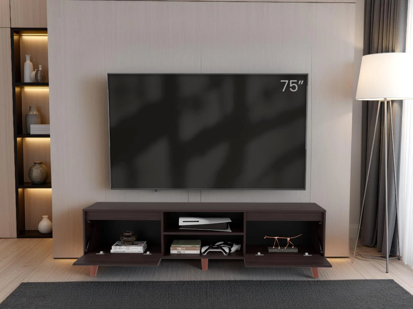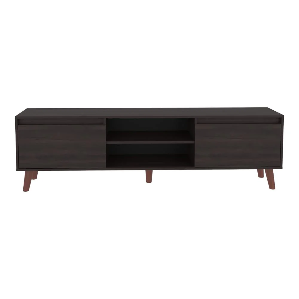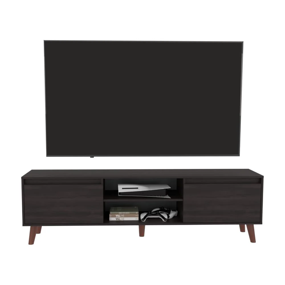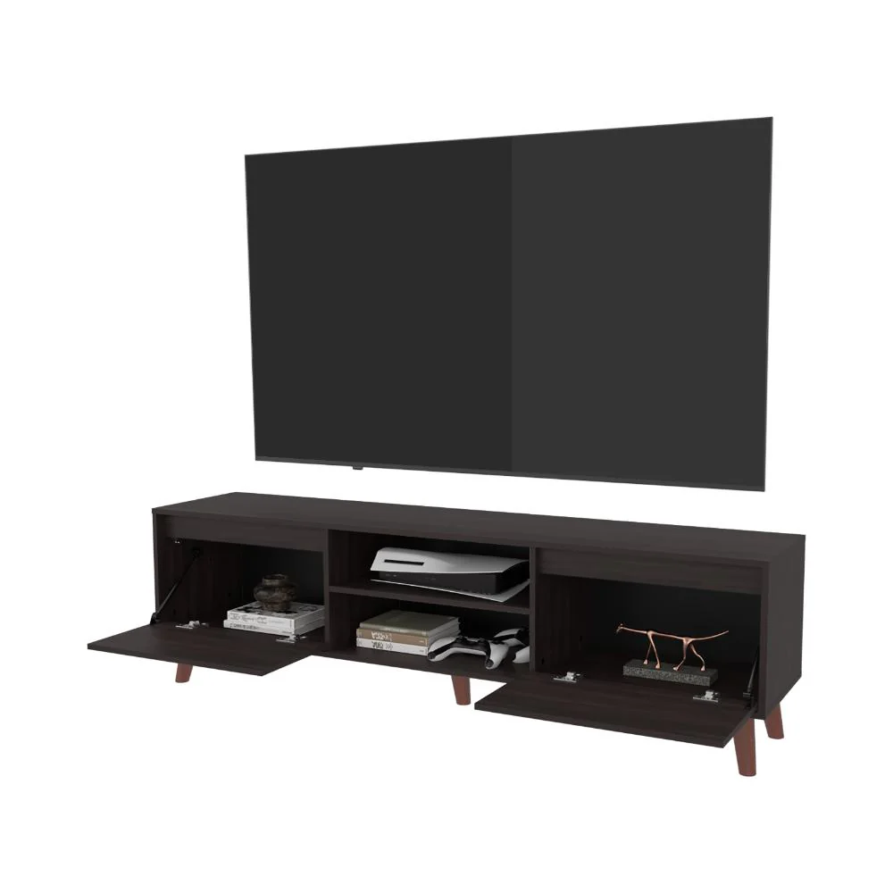 Mesa para TV, con 2 puertas abatible, con espacio para ubicar objetos decorativos, de audio y video, con capacidad de tv hasta 75″