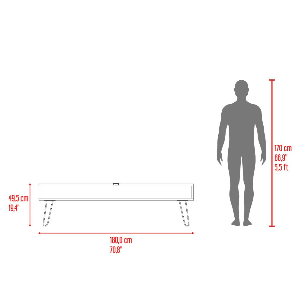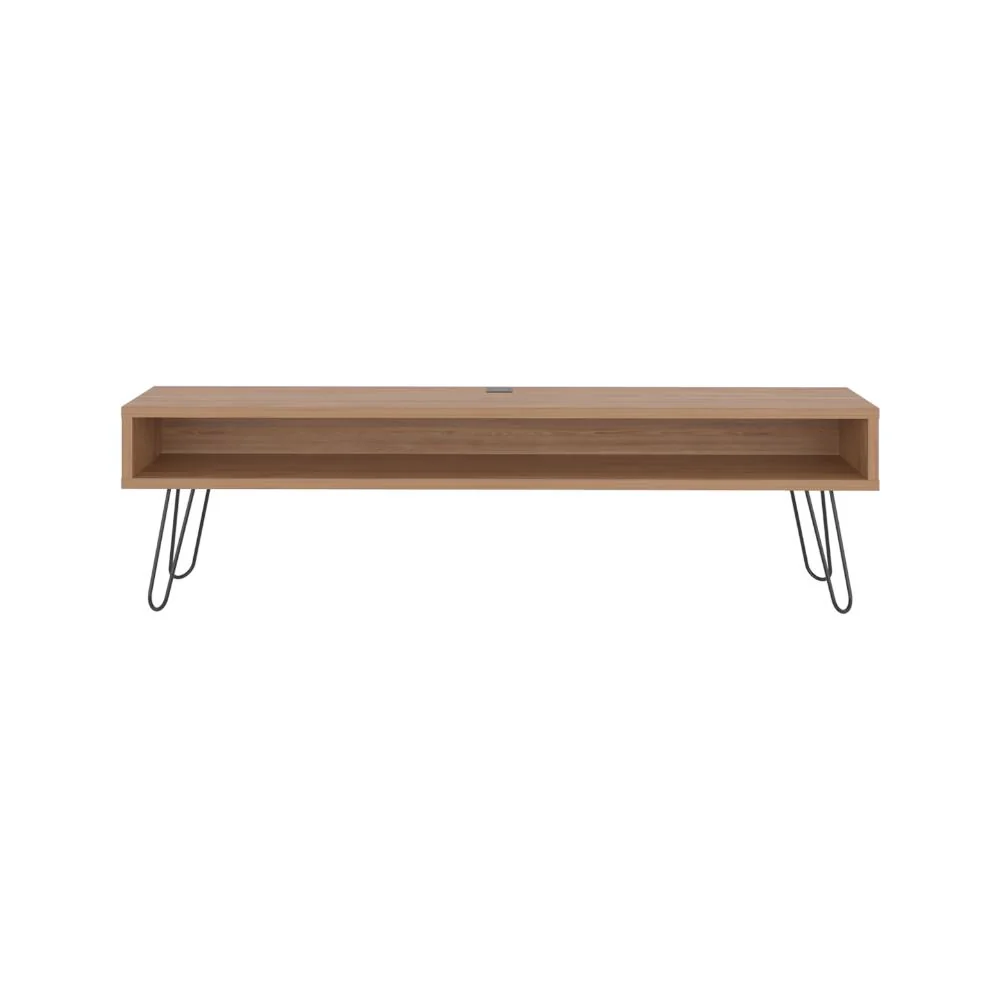 Mesa de TV, con un diseño contemporaneo, cuanta con espacio para ubicar objetos de audio de video, patas metalicas, incluye pasa cables, y con espacio de tv hasta 70 pulgadas