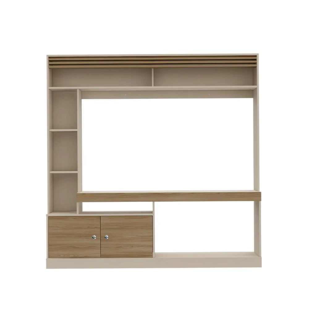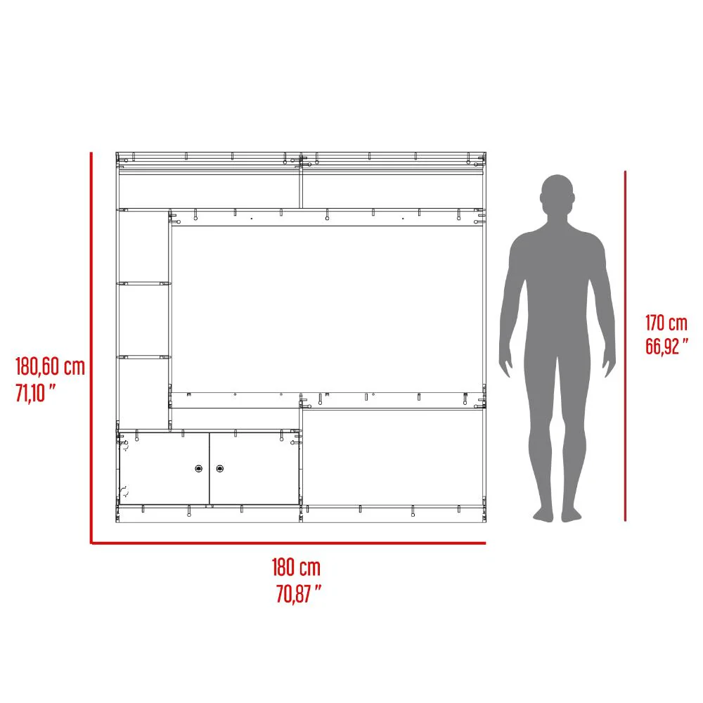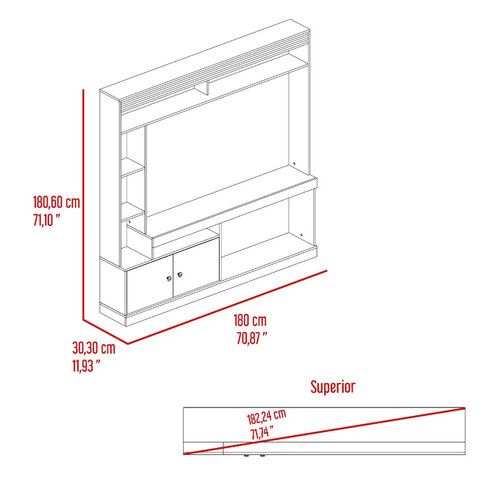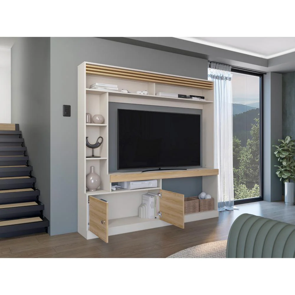 Mesa para TV, con 2 puertas abatibles, espacio para ubicar Tv de hasta 50″, espacio para ubicar equipos de audio y video, manijas metálicas tipo botón y, amplios espacios para ubicar objetos decorativos.