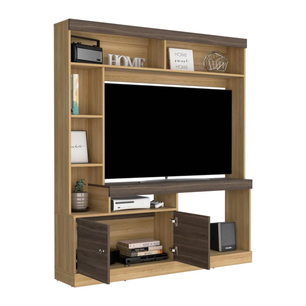 Mesa para TV, con 2 puertas abatibles, espacio para ubicar Tv de hasta 50″, espacio para ubicar equipos de audio y video, manijas metálicas tipo botón y, amplios espacios para ubicar objetos decorativos.