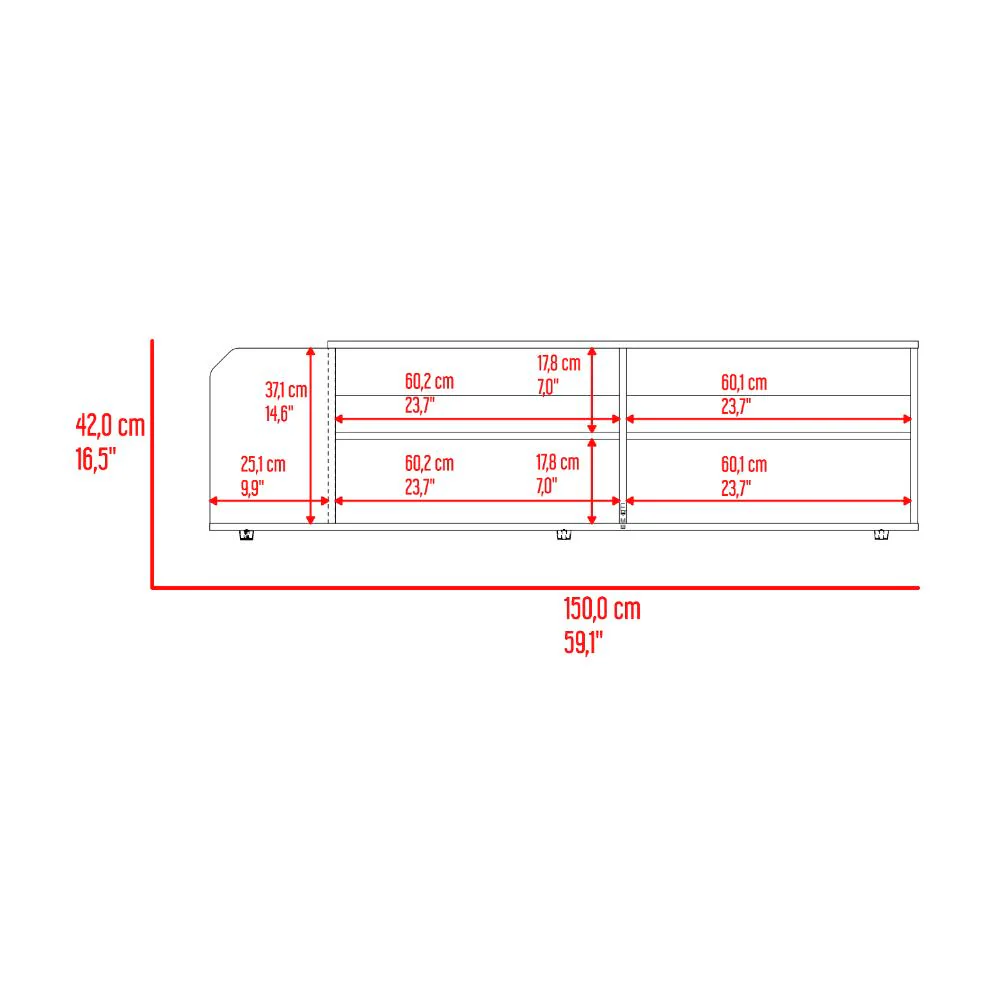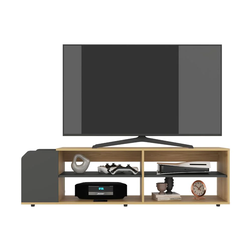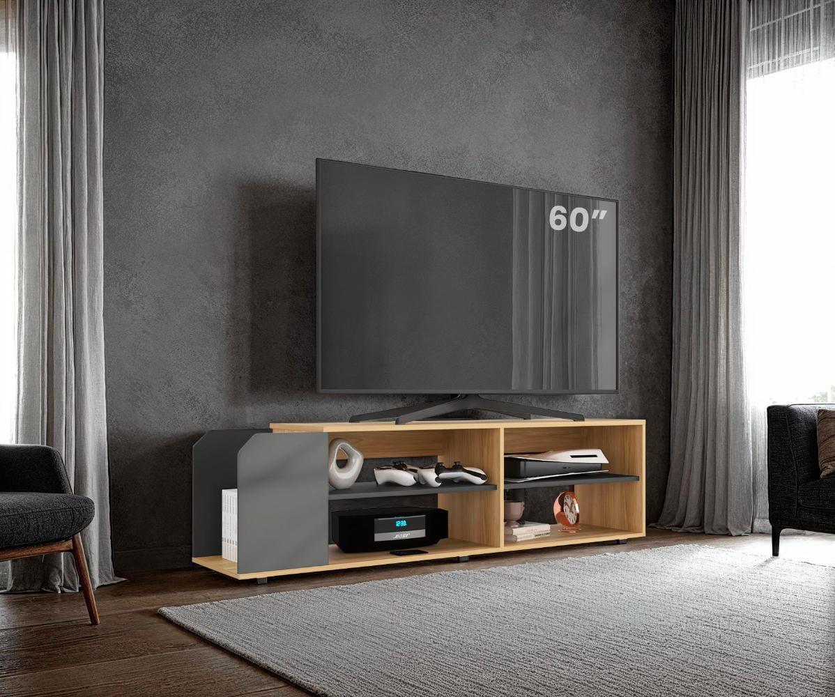 Mesa para TV de 60″. cuenta con cuatro compartimentos para almacenar objetos.