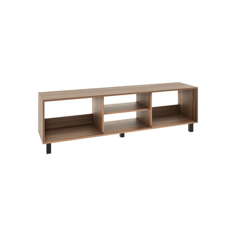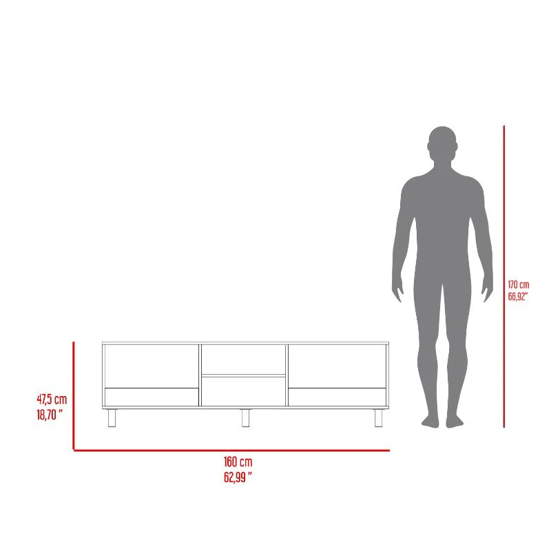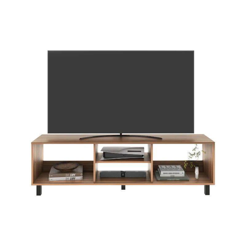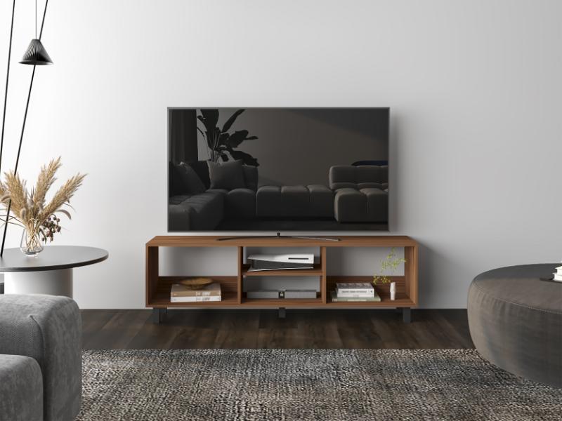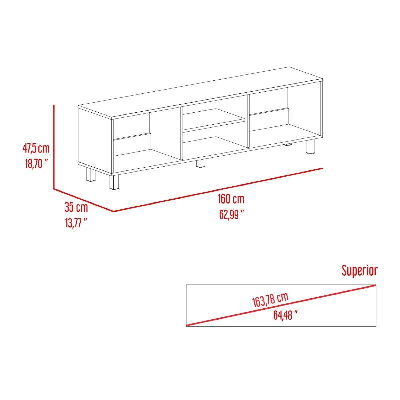 Mesa para TV de 70″. cuenta con un entrepaño y cuatro compartimentos para almacenar objetos.