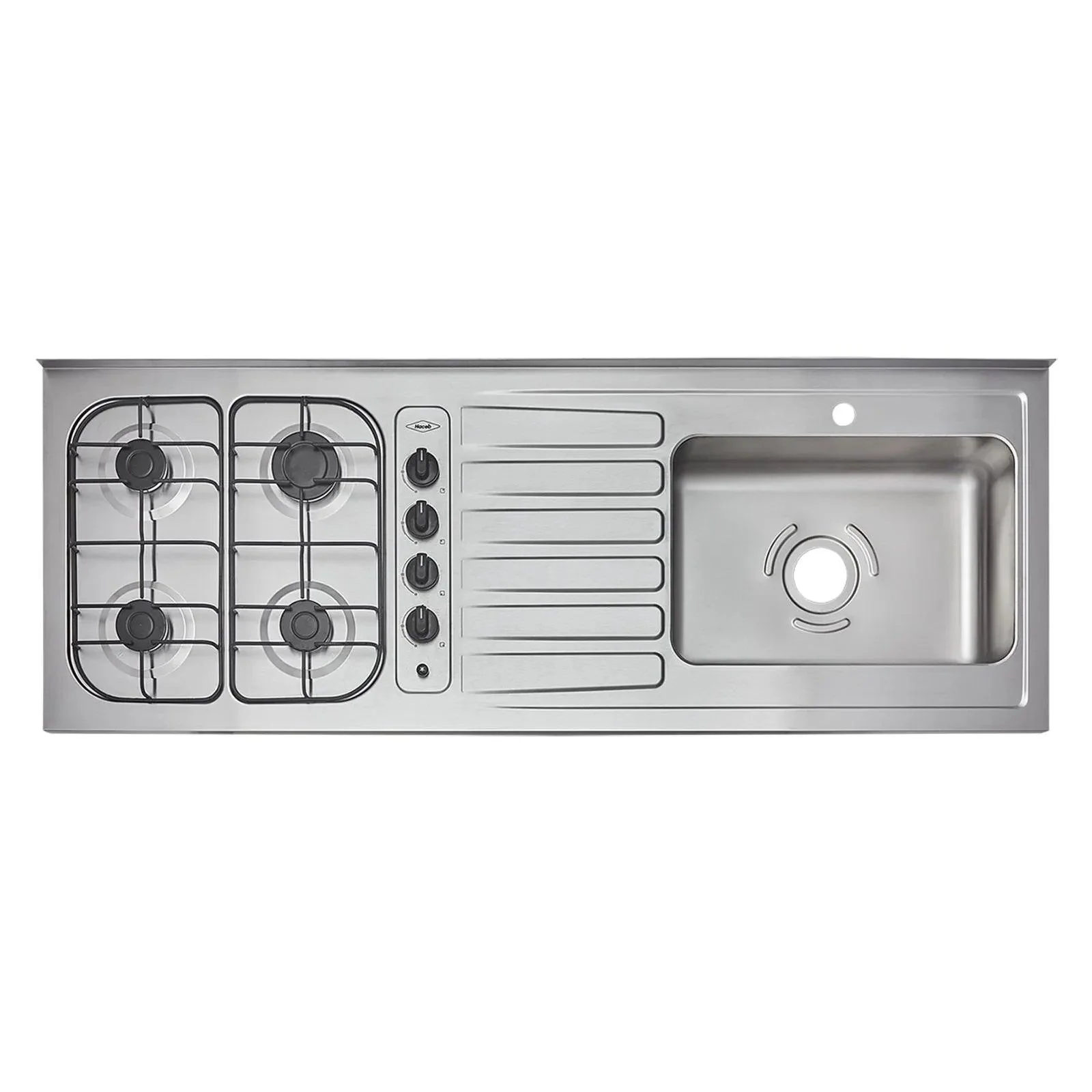 Mesón en acero inoxidable de 1.50 metros de ancho, con ubicación derecha del pozuelo, con encendido eléctrico, 4 fogones a gas natural con parrillas en alambrón con puntos de apoyo óptimos por recipiente para más seguridad. Cuenta con un sistema de anti-empozamiento en el lavaplatos y prensado en el centro del mesón que evita la acumulación de agua y el desplazamiento de líquidos al interior del mueble.