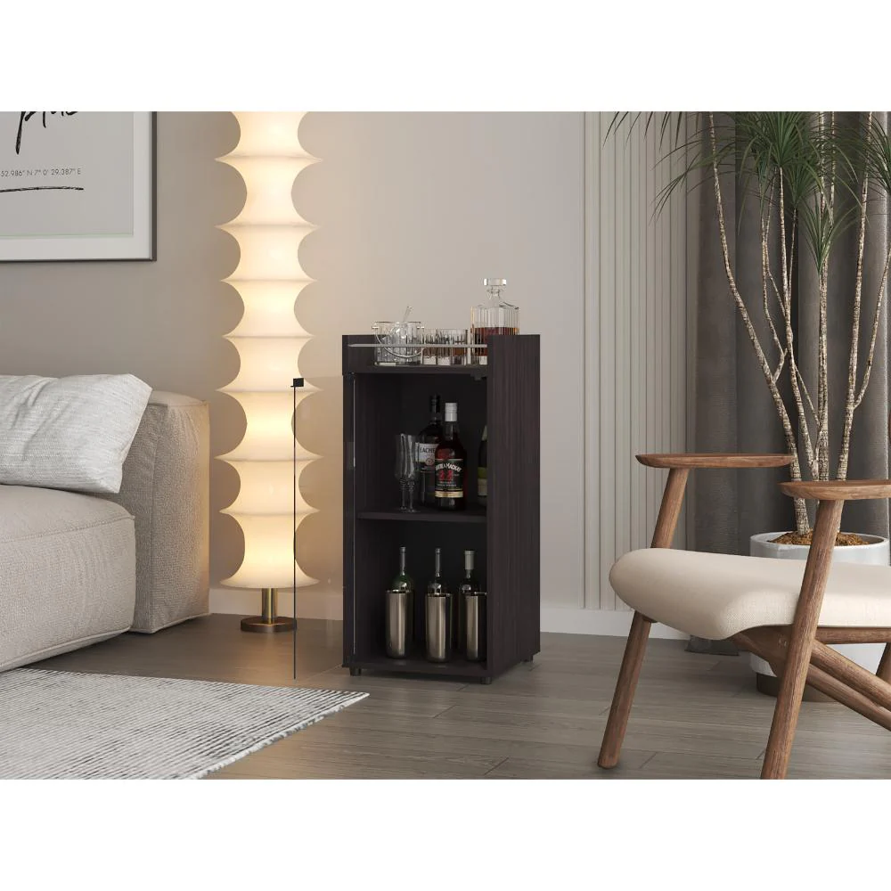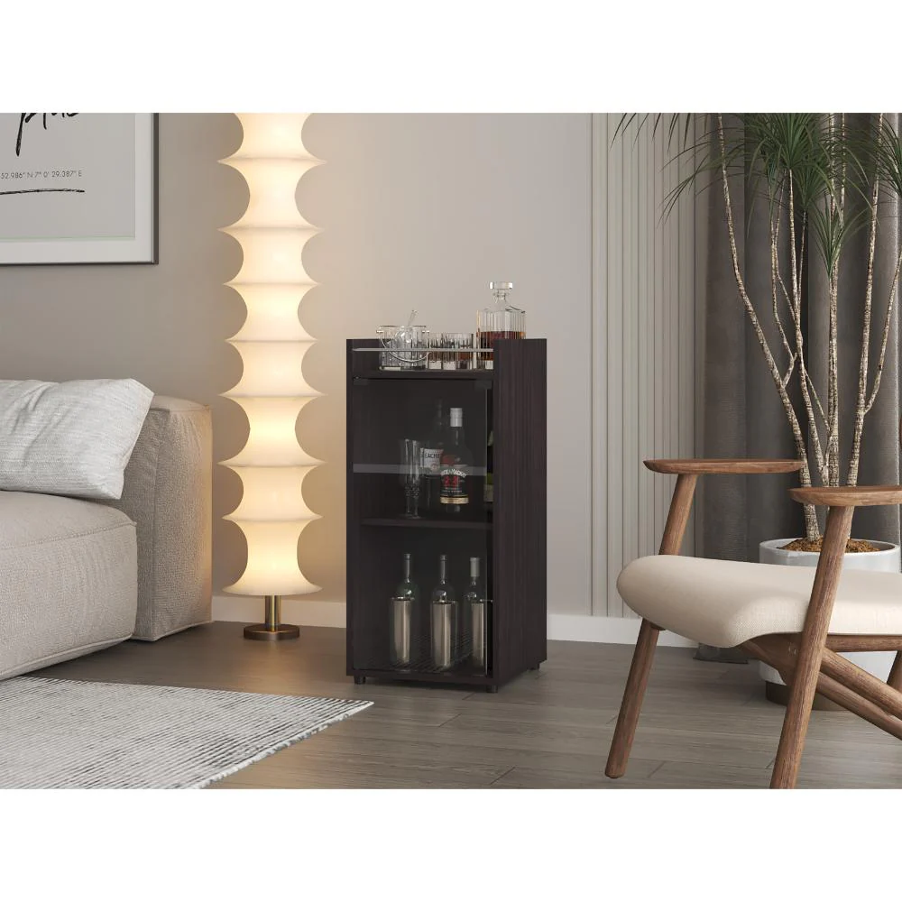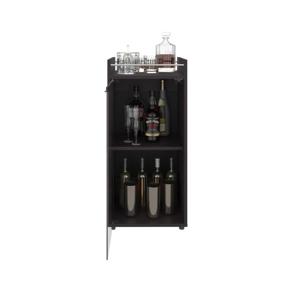 Minibar, con espacio para botellas de vino y copas, una puerta de vidrio y de facil instalación.