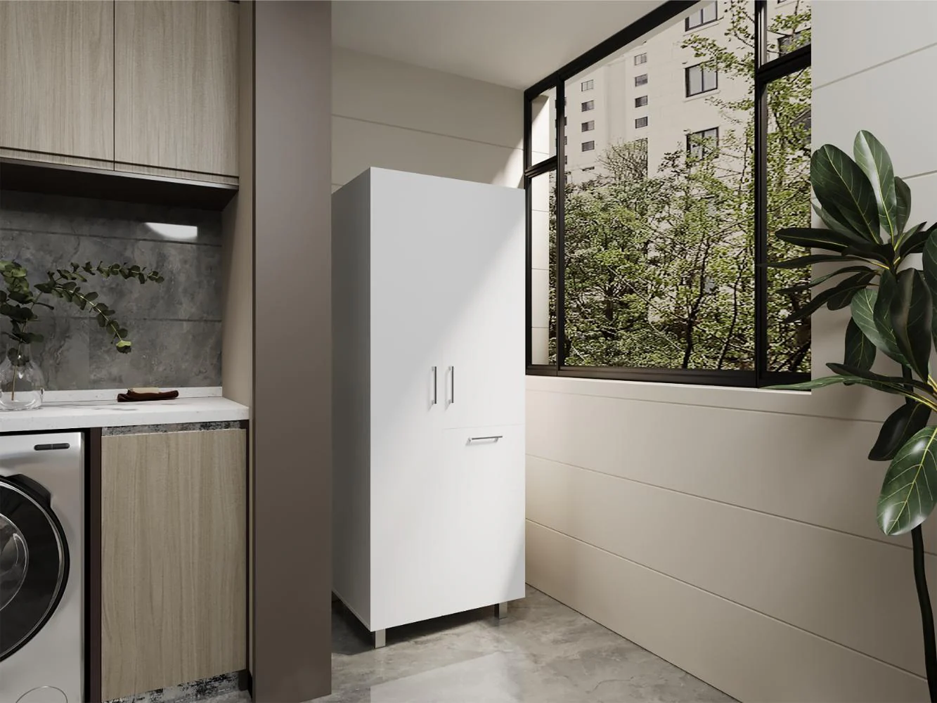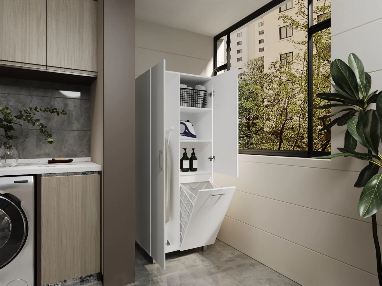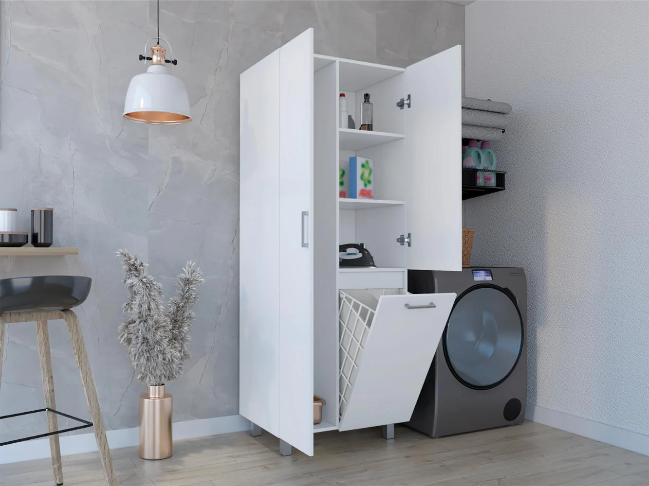 Muebles Aseo con espacio para ubicar objetos de aseo, incluye porta escobas, cesto para la ropa sucia, 3 puertas abatibles y es de facil instalación.