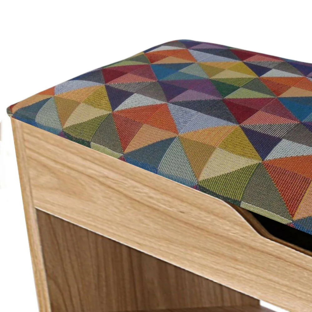 Mueble Organizador Baúl Zapatero en Melamina con protección antimicrobiana 99,9%, Tapa tapizada en tela Colors gobelino. Incluye espacio para sentarse y espacio con puerta para guardar, ideal para organizar y decorar