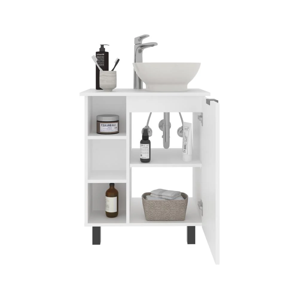 Mueble Lavamanos, con una puerta abatible, un entrepaño interno, 4 entrepaños externos que le brindan un toque de modernidad, y con gran espacio para colocar objetos.