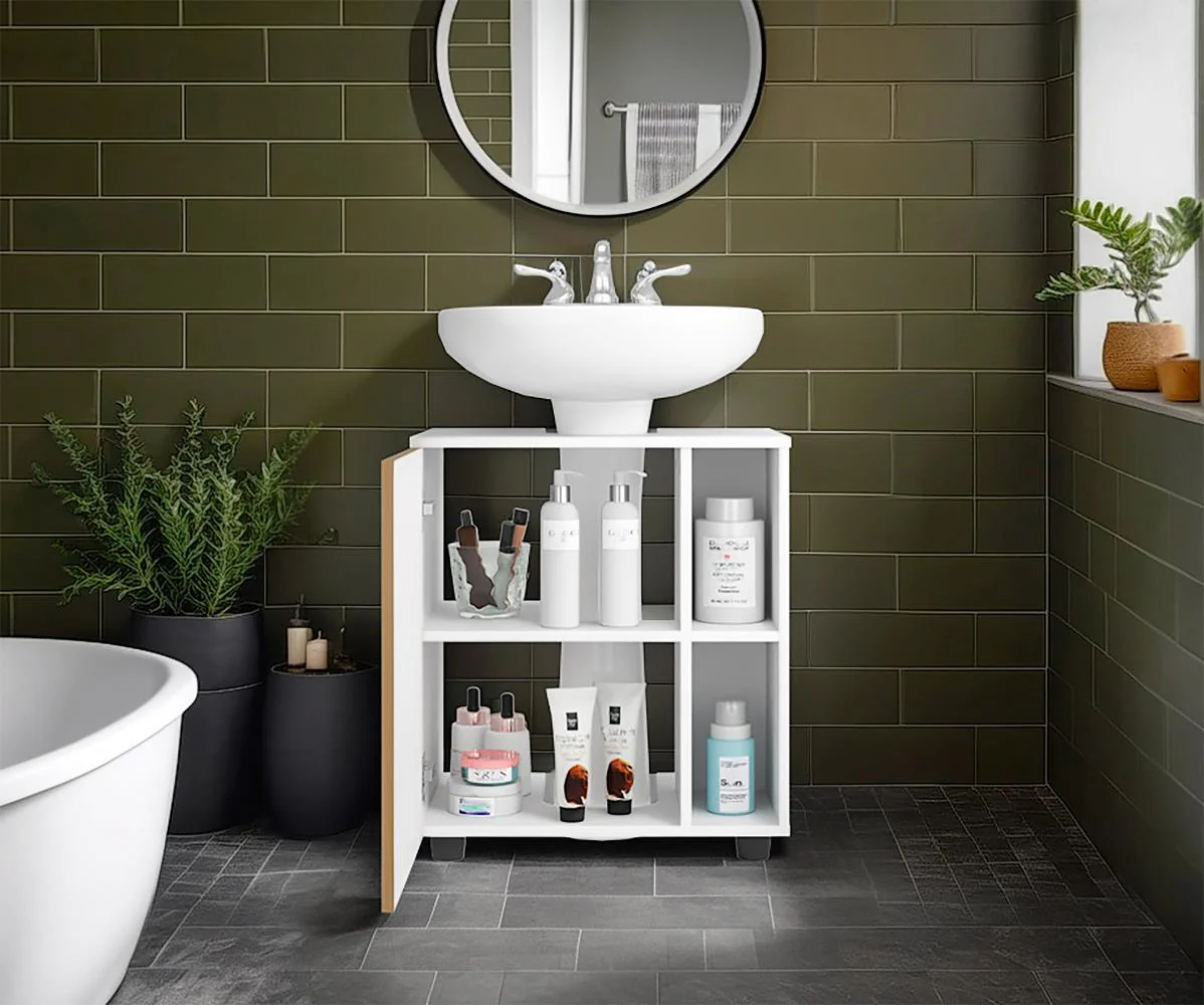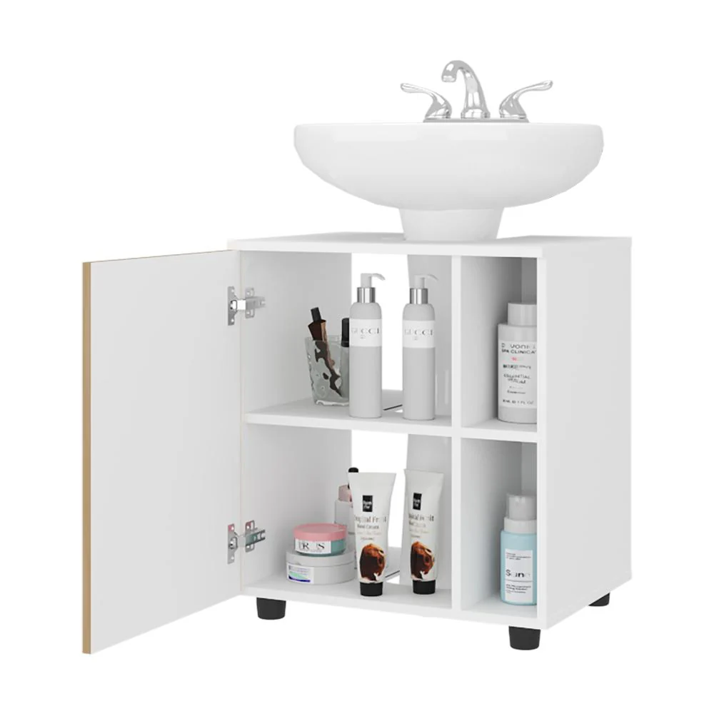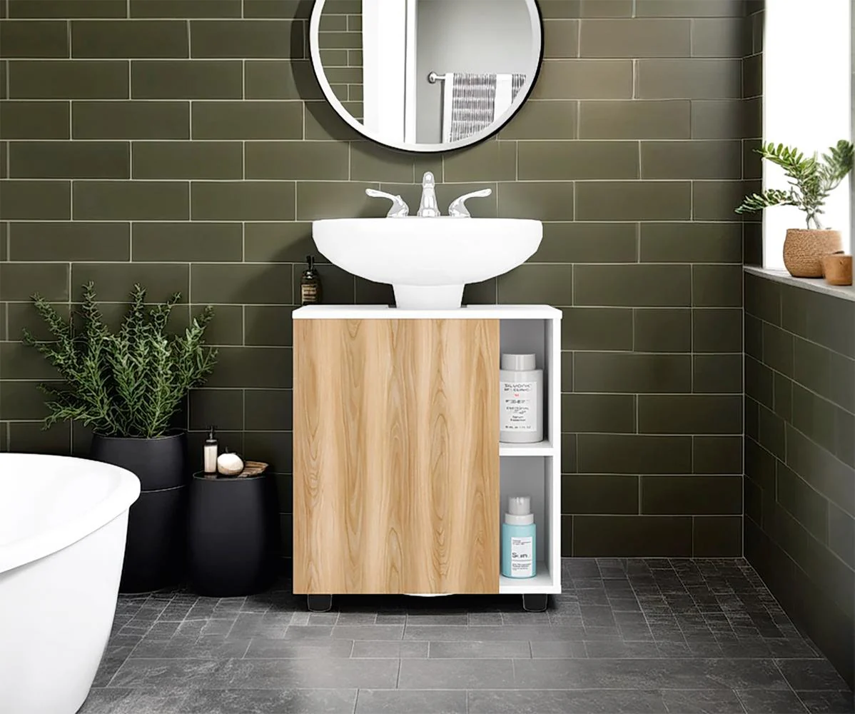 Mueble Lavamanos, de pesdestal moderno, 1 puerta abatible, con espacio para ubicar objetos decorativos y es de facil instalación