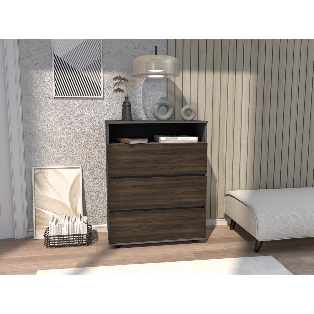 Organizador, con un diseño practico, cuenta con 3 cajones para almacenar, y con espacio para colocar objetos y decoración.