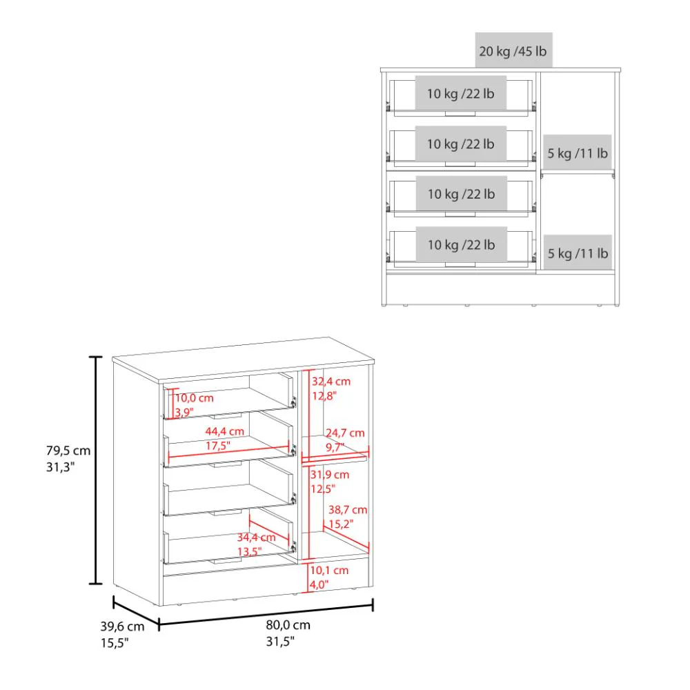 Organizador, con cuatro cajones para guardar y organizar, superficie para elementos decorativos, patas metálicas