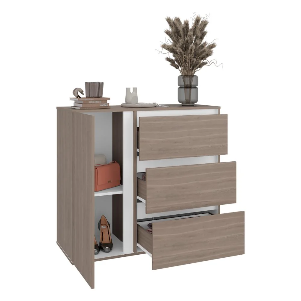 Organizador, con espacio para objetos decorativos, combinación de colores, tres cajones con gran capacidad de almacenamiento, 1 puerta abatible, es de facil instalación.