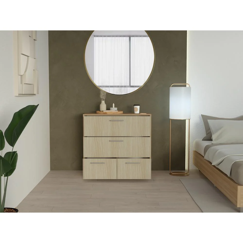 Organizador, con 4 cajones para guardar objetos personales, espacio superior para objetos decorativos y manijas metálicas