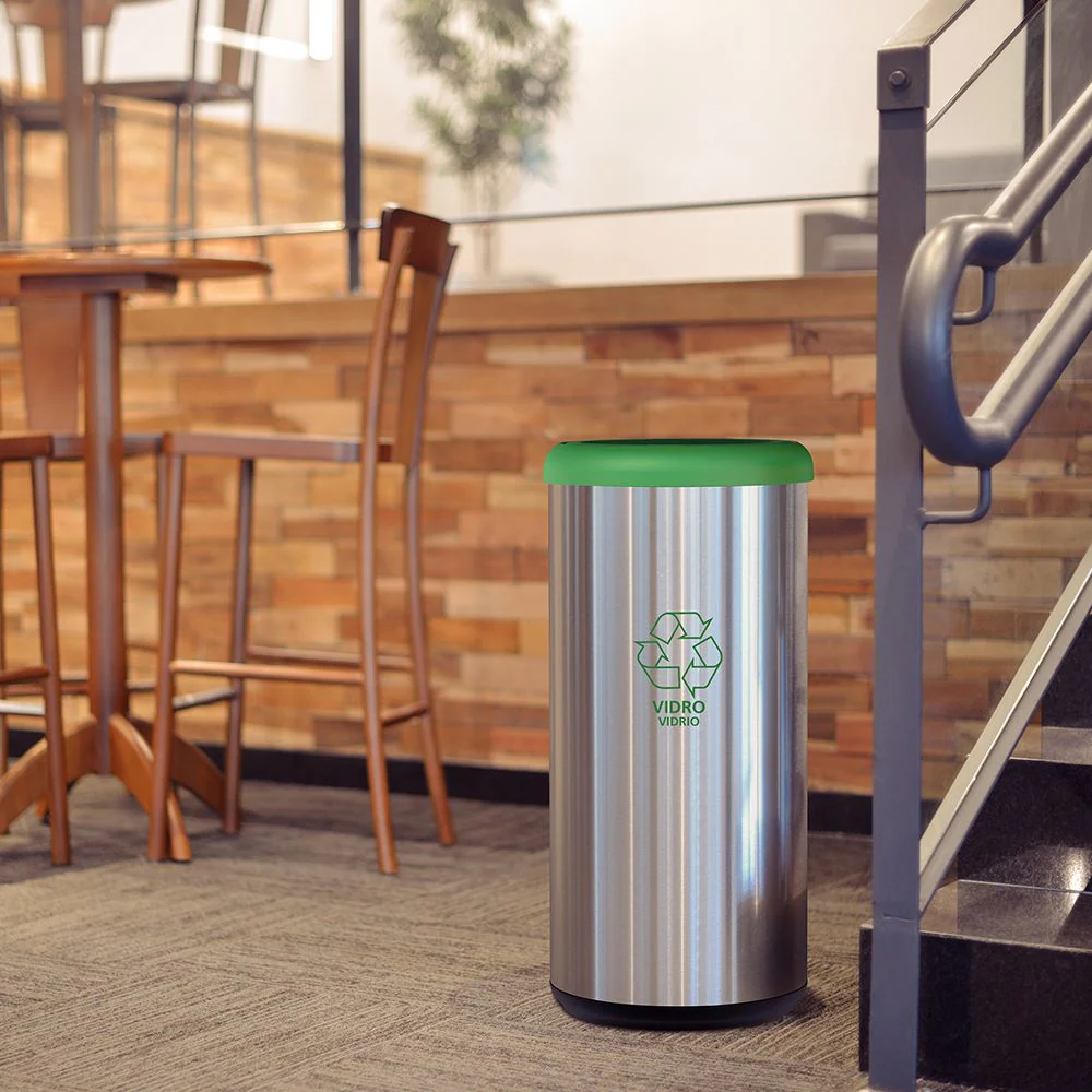 Papelera, elaborado en Acero Inoxidable, con capacidad de 40 litros, tipo de acero 304, espesor 0,4 mm, acabado en scotch brite, tapa basculante, su uso puntos ecológico, incluye etiqueta informativa no adherida.