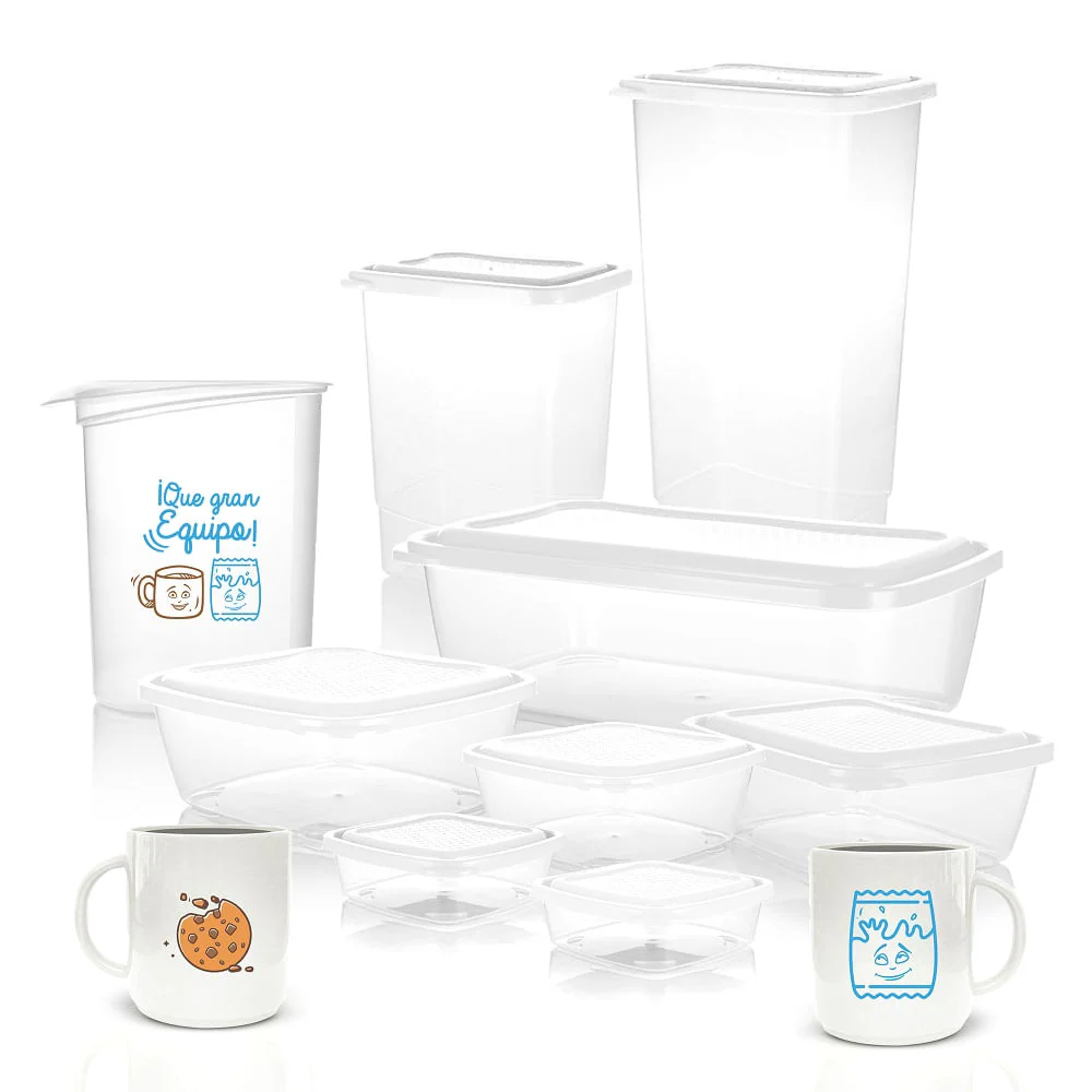 Composición: 2 recipientes cuadrados de 0.5L, 1 recipiente cuadrado de 1.1L, 1 recipiente cuadrado de 2.3L, 1 recipiente rectangular de 1.2L, 1 recipiente rectangular de 3L, 1 recipiente alto de 3L, 1 recipiente alto de 2L, 1 Jarra nopal de 1L, 2 mugs de 14OZ