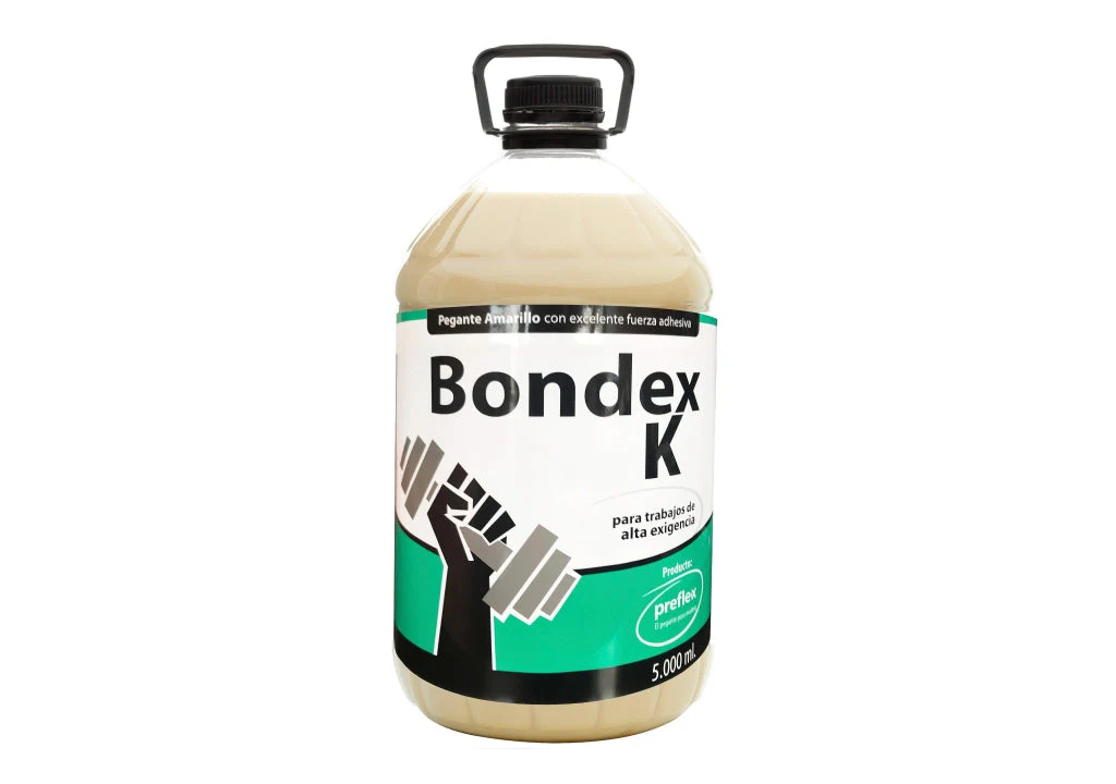 Pegante bondex k 5 litros este pegante es ideal para trabajos de madera de baja a media densidad con un contenido de humedad de aproximadamente 13%. Recomendado para laminación sin acabado y entamborado, este adhesivo no mancha y forma una película transparente. Es fácil de aplicar, tiene un tiempo abierto medio, buena resistencia térmica y permite un tiempo de prensado prolongado.